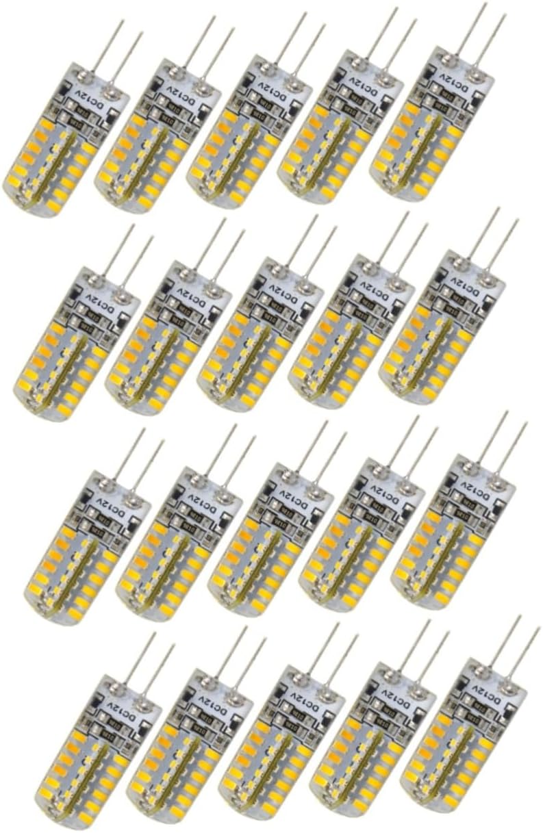 Package List 20 * G4 DC 12V 3.5W 170LM 3000-3500K SMD 3014 48-LED Bulbs Lights (Warm White) Characteristics - Input voltage: DC 12V G4 LED bulb 12V. - Material: High-grade silicone and capacity cell DC G4 LED bulb. - LED type: 48pcs SMD 3014 G4 LED bulb. - LED color: Warm white. - Luminous flux: 170 lumens. - Beam angle: 360-degree. - Power: 3.5W. - Base type: G4. - G4 LED light bulb - , saving over 80% energy 3.5W LED bulb. - Easy to install, simple to replace for convenient to use. - No , no , or other deleterious . - Environmental-friendly, with low power consumption and ultra .Goods DescriptionG4 LED bulb 12V 5W LED .G4 LED bulb The LED bulb features save over 80% energy, easy to install and long .3.5W LED bulb Each one is fully suitable for Standard G4 base.DC G4 LED bulb The item is a set of 10pcs G4 DC 12V 3