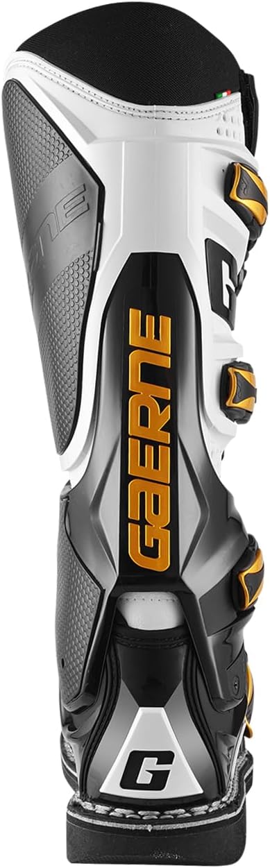 The SG12 boot stands as the ultimate benchmark in Motocross boots, a reference for all motocross and enduro fans. The DSPS (Dual Stage Pivot System) provides superior lateral support preventing over-compression and hyper-extension, while allowing the rider’s foot to feel natural on the peg during shifting or braking. The boot features a PU-injected front shin plate and a strategically designed heel cup for enhanced protection and comfort. The Toe-Box is precision-shaped in the toe area, enhancing the rider's feel of the shift lever, and optimizing bike control. The Closure System comprises four lightweight and replaceable buckles, featuring rubber details for optimal grip and traction during use. Additionally, a Velcro strap on top ensures a precise and secure fit closure. The first two top buckles are adjustable, providing versatility to accommodate larger legs or knee braces. The "Grip Guard" rubber on the inner side of the boot not only provides exceptional grip with the bike but also functions as heat-resistant padding against the inner leg. The interior lining showcases the renowned 'Gaerne Memory Cell Foam,' which delivers a customized and supportive feel. This advanced foam ensures an optimal and comfortable experience throughout use, enhancing overall comfort and performance. The insole is expertly molded to provide proper support to the foot. In the rear portion of the foot-bed, a new shock-absorbing material has been incorporated, ensuring comfort during rides. The front portion of the construction is designed to allow for ventilation, promoting air circulation and keeping the foot cool. The Gaerne Goodyear Welted artisanal construction, a technique consistently employed by Gaerne since 1962, ensures the creation of a robust and durable sole structure. This commitment to quality craftsmanship and longevity has become a cornerstone of Gaerne motocross boots. Furthermore, this construction method allows for easy resoling, offering an opportunity to breathe new life into the boots. Our unwavering dedication to Goodyear Welted construction is a testament to our commitment to maintaining exceptional standards in our products. The Dual Composite Sole is equipped with a tailored tread pattern engineered to deliver exceptional traction on cross-pegs, particularly in challenging wet and muddy terrain. The SG12 boot is CE certified in accordance with EN 13634:2017 and Regulation EU 2016/425. Made in Italy.