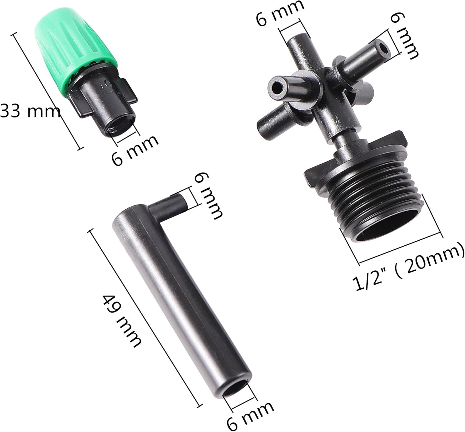 Specification:Name: 5-Way Misting Nozzle kitWorking pressure: 1.5-3 BarSpray radius: 0.7-0.9mFlow rate: 8-10 L/HColor : Green with BlackConnection size: 1/2" male threadSprayer Type: Atomizing SprinklerApplication: Garden irrigation,cooling,humidification,Dust removal Landscaping, disinfection etc.Please note:1.The size is measured by hands, there may be some deviation, but it does not affect the use.Please read the product size on the details page carefully before purchasing. Thank you.2.Due to the different ambient light and different display device settings,there may be some deviations between the pictures you see and the items themselves. Please understand.3. Support dropship, there will be no information in the package.4. Support wholesale, contact us, we will you the best price.