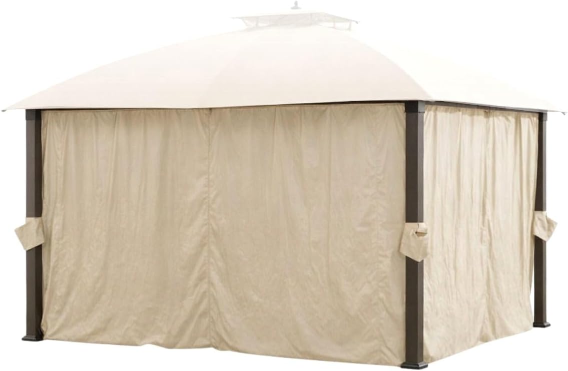 Replacement privacy curtain set compatible with Broyhill Eagle Brooke and Ashford 10' x 12' Gazebo, custom fit for models A101007600, A101007603, and A101007604, SKU: 810452404, 810490347 sold at Big Lots and various retailers. Made from 350 denier polyester in Beige, the fabric is UPF 50+ UV Resistant, water resistant, and CPAI-84 fire retardant for outdoor use. Backed by a 1-year limited performance warranty with US-based customer support for fit and product questions. Replacement privacy curtain set only; gazebo frame, canopy top, and mosquito netting not included.