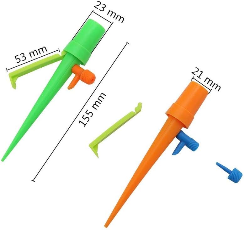Easy to use-connect the water connector to the connectorSpecifications: Name: Adjustable automatic self watering deviceMaterial: PVC Characteristics: Have support bracketColor: Green Spike or Orange Spike, the valve's color randomPacking: 50 PcsInstruction:1. Add water to the plastic bottle;When using the product, it must be cut at the bottom of the cola bottle to ensure air circulation, in order to drip irrigation,2. Insert the needle into the dirt and adjust the knob to control the flow.Features: Self-watering probes are a simple and effective way to water plants during a holiday. The automatic watering device needs to be inserted vertically into the soil.Flow rate control, plant watering device with control valve can control drip speed 0-60s / 1 drip, release lasts drip for 1-15 days;Suit for bottle with an inner diameter of 1.1 inches; such as cola bottles, sprite bottles, etc.This is the perfect choice for watering any indoor plant. It is perfect for those who travel and want to make sure their plants are properly watered. The large planter will require two or more plant fountains. NoteIt is manual measurement, there may be 1-2mm error.Due to the difference between different monitors, the picture may not reflect the actual color of the item. Thank you.