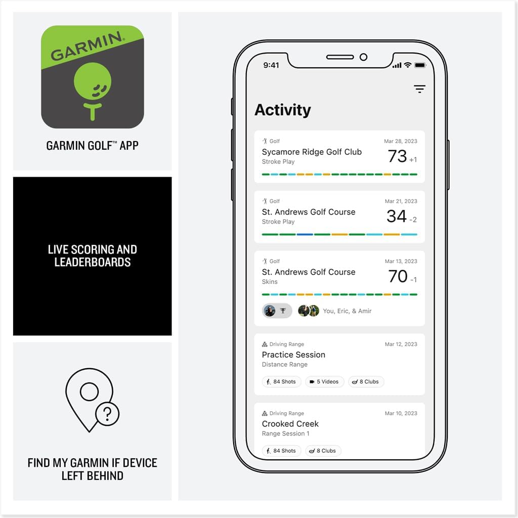 | Additional Features | 43,000 preloaded courses, Built-in magnetic mount, Easily see and view yardages, Get unlimited battery life or up to 36 rounds with limited sun, Green view display, Pair with the Garmin Golf smartphone app |