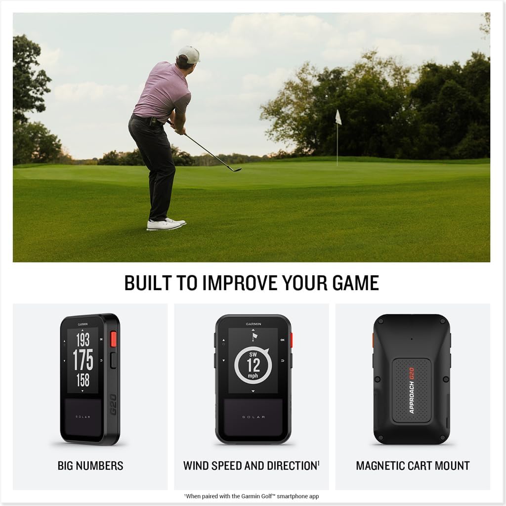 Garmin Approach G20 Solar GPS Golf Handheld Never let battery life limit your game again. The Garmin Approach G20 Solar GPS Golf Handheld is built for golfers who demand precision, endurance, and accuracy. With unlimited solar-powered battery life in sunny conditions (75,000 lux), this golf GPS ensures you’re always ready to play. Even on cloudy days, enjoy up to 36 rounds per charge, so your focus stays on hitting fairways, not finding a charger. Step onto any course with 43,000+ preloaded courses worldwide. Get precise yardages to greens, hazards, and doglegs. The 2.2” sunlight-readable display delivers big, bold numbers, ensuring visibility in even the brightest conditions. No more squinting, just easy-to-read distances that keep your game sharp. Take your performance to the next level by pairing it with the Garmin Golf app. Access real-time wind speed and direction, live scoring, and even a Find My Garmin feature in case you leave your device behind. Want deeper insights? Add Approach CT10 sensors (sold separately) for automatic shot tracking and data-driven improvements. With a built-in magnetic cart mount and belt clip, your GPS is always within reach. Rain or shine, this water-resistant (IPX7) golf companion stays ready. If you want to play smarter, longer, and with complete confidence, the Approach G20 Solar is ready to take on the course.