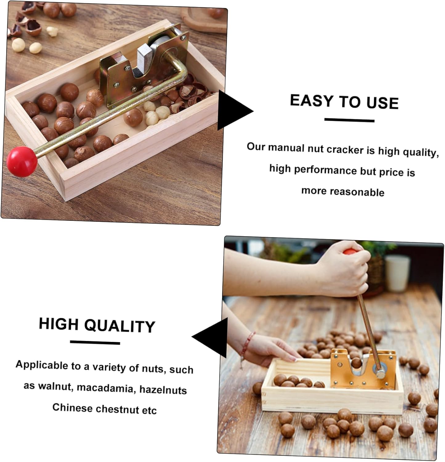 Package List 1 x Nut Opener Characteristics -Material: Wood & Plastic & Alloy Nut Sheller -Size: Approx. 25 x 4.5 cm / 9.82 x 5.5 x 1.77 inch Nut Tongs -Color:Beige Sturdy Nut Opener -With a small ball on the of the handle, anti-slip and easy to hold Useful Nut Sheller. -With leveraged design, it is easy to use and labour saving, making your life become convenient Macadamia Shell Peeling Tool. -And the nutcracker features a thick wooden storage basket, which is is smooth and to store nuts Nut Peeling Machine. -The nutcracker is easy to crack nuts, macadamia, pecans, hazelnuts, almonds, walnuts, paran nuts etc Nut Opening Tool -Adoption of , great high hardness, and use Chinese Chestnut Opener.Goods DescriptionNut Opening Tool Don't hesitate, come to choose one.Manual Nut Cracker A great kitchen gadget for home.Walnut Tong for Home This is a great gadget for you to open your favorite nuts, pecans, almonds, brazil nuts, hazelnuts and having a joyful.Nut Tongs Made of wood, plastic and alloy materials for and use