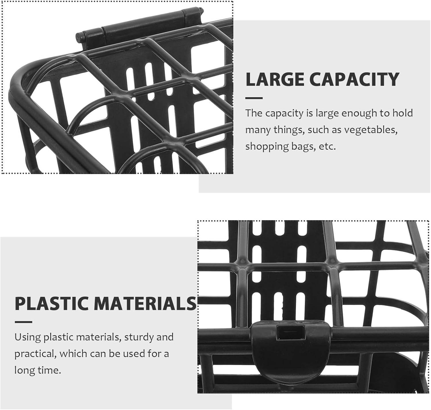 Package List 1 x Bike Basket Characteristics -Material:Plastic -Product Info:Car basket -Size:31.00X26.50X24.00cm/12.18X10.41X9.43in -Color:Black -The size fits most bikes, and it is also very easy to install on the handlebar of the bike. -Using plastic materials, sturdy and practical, which can be used for a long time. -The capacity is large enough to hold many things, such as vegetables, shopping bags, etc bicycle basket front handlebar plastic. -It has a very strong load-bearing capacity, and the thickened texture is more durable bike basket front. -This storage basket is very stable, which is not easy to damage or fall off the cycling bicycle basket front.Goods Descriptionbike basket front handlebars It is one of the for you.bike basket front adult Fine workmanship ensures the practicality and durability, a good helper for you.basket for folding bike Are you looking for a professional, yet bike basket? Are you in search of a sturdy, trustworthy bike basket that can do multiple jobs at once? , ! Our professional bike basket must meet your needs