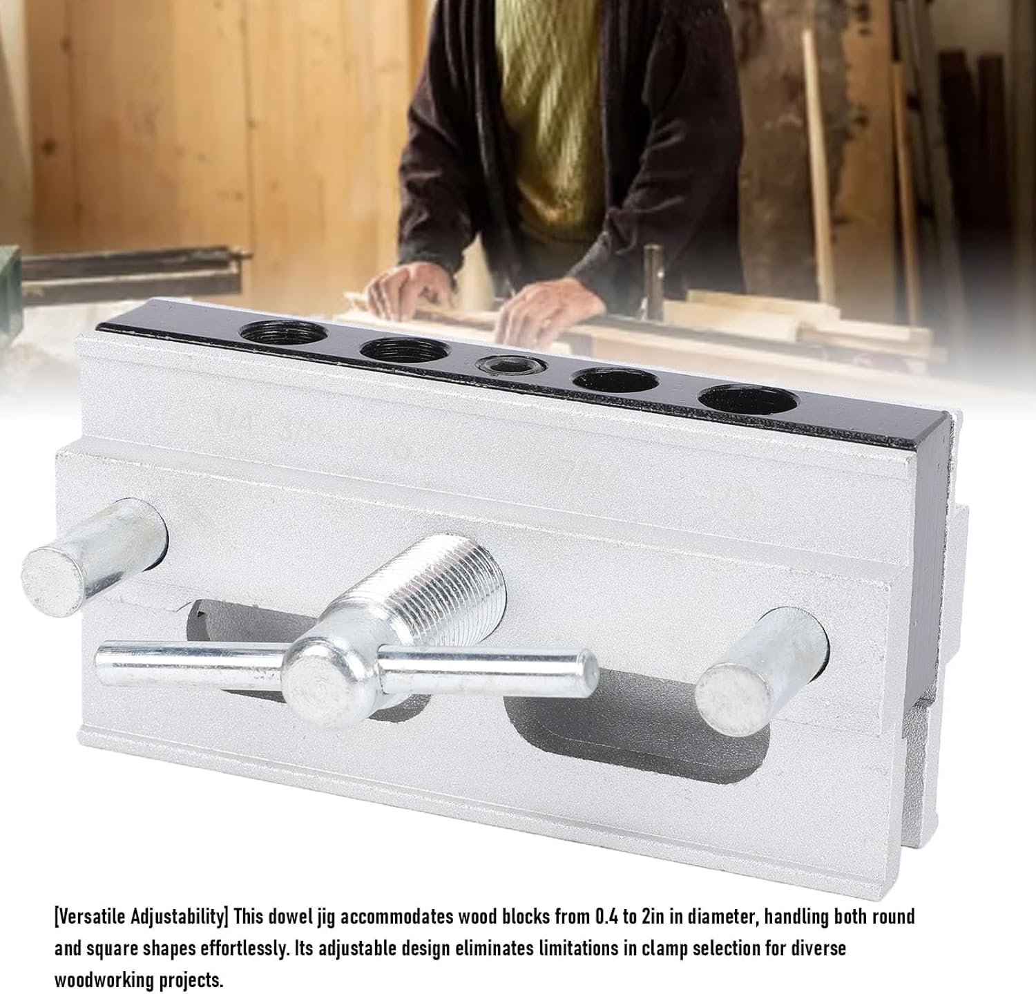 Spec: Item Type: Self Centering Dowel Jig Kit Material: Aluminum Alloy, No. 45 steel Drilling Specification: 1/4in, 3/8in, 5/16in, 7/16in, 1/2in Package List: 1 x Woodworking Hole Locator 6 x Position Pins 1 x Wrench 1 x Instruction Manual