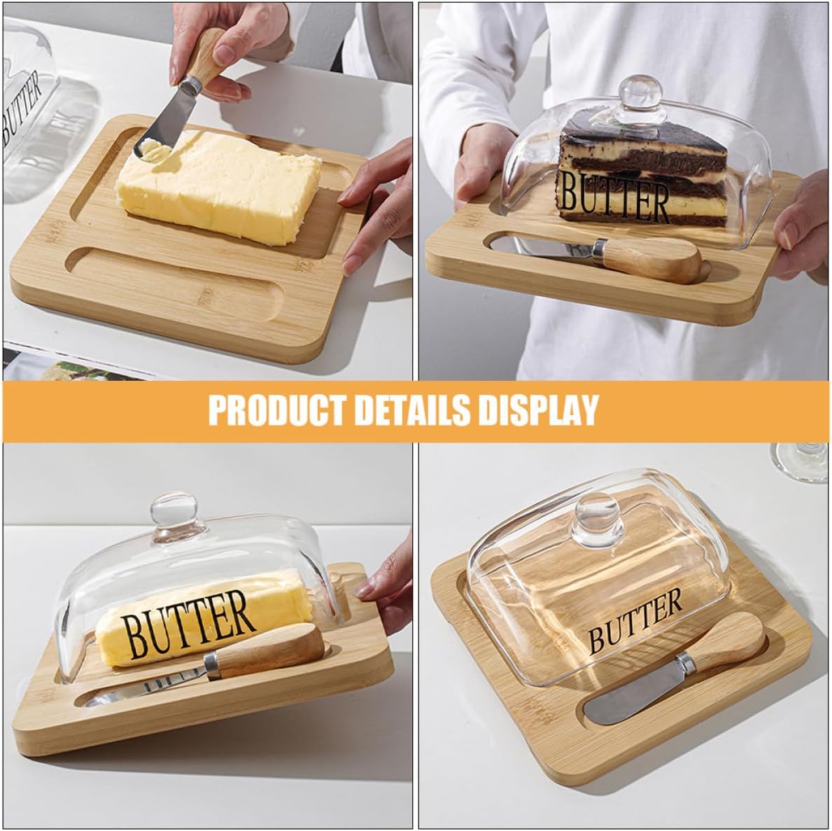 Package List 1 x butter tray 1 x dome 1 x cutter Characteristics -Size:12.90X3.40X2.00cm/5.07X1.34X0.79in -Product Info:Butter box -Color:Transparent -Material:Wood, glass, stainless steel -Size:19.60X19.00X8.50cm/7.70X7.47X3.34in - With this reusable butter dish you can store the butter to not be tainted by other odor butter container with lid. - This convenient butter keeper perfectly matches most kinds of butter, to satisfy your daily use butter dishes with lid. - With the lid design, Butter Dish and Lid can keep your cheese or butter clean and safe counter top butter keeper. - Utility butter dish with sealing lid to keep your butter fresh, provides a natural style for your kitchen french butter dish with lid. - You will find your kitchen countertop neat and orderly after using it, improving your life greatly countertop butter keeper.Goods Descriptionbutter dish with dome Let this butter storage box be the most stylish kitchen utensil you could ever have.butter dome with lid You can use it to store any type of solid butter or cream cheese.counter butter dish Household Butter Storage Box, with a sealing cover and a cutting tool for convenient use