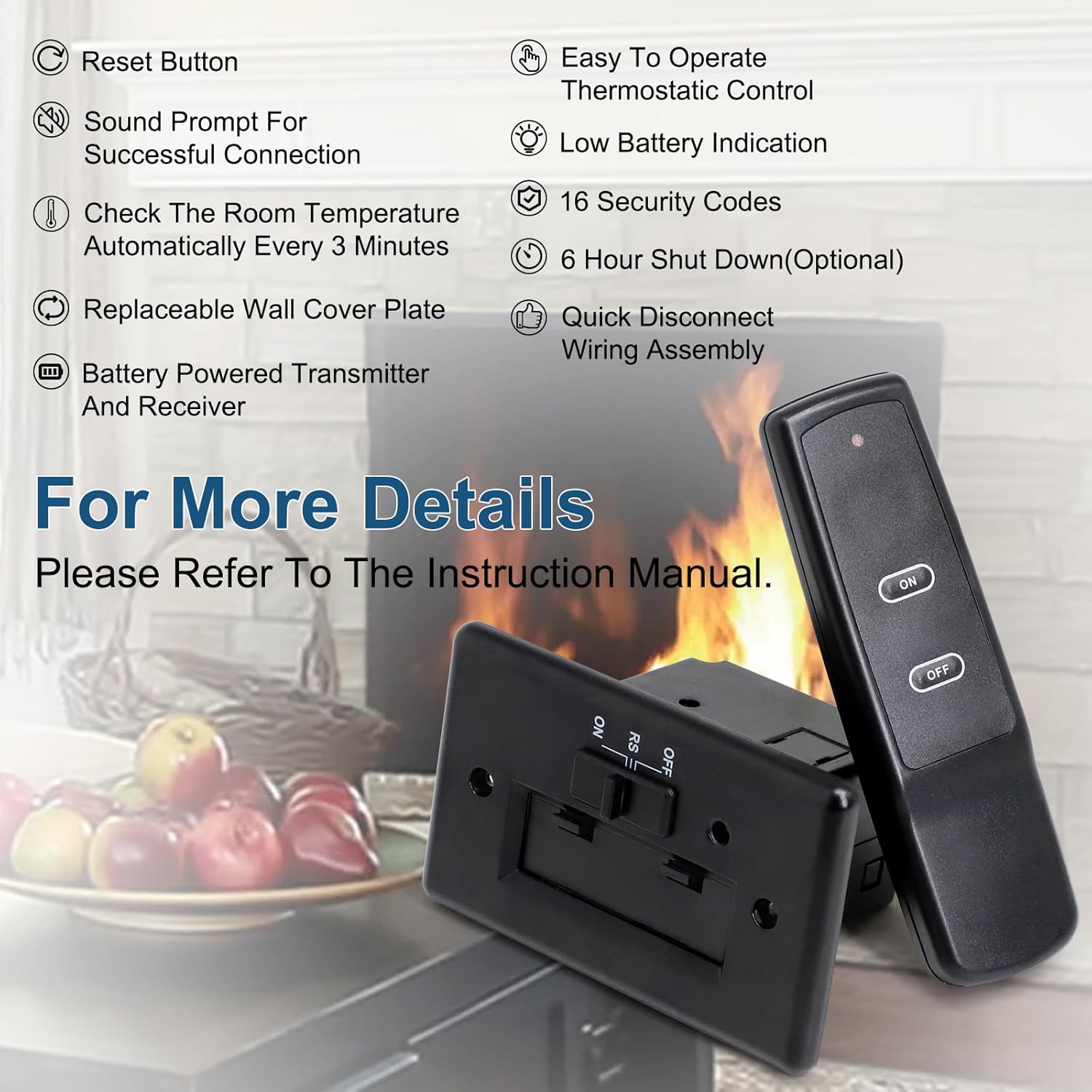 Packaging ContentGas Fireplace Remote Control Remote On/Off Kit Includes:✔ 1 Pcs Thermostat Remote✔ 1 Pcs Receiver Box✔ 1 Pcs Battery Door with Black and White Slide Buttons (ON/RS/OFF)✔ 1 Pcs Plug-in Wiring Assembly, Screws✔ 1 Pcs 22 inch Power Cord✔ 1 Pcs Connectors✔ 1 Pcs Installation Instruction ManualCompatibilitySkytech Majestic Ambient Majessen Monesen Vermont gas fireplace stoves✔ sky-1001-a✔ sky-1420-a✔ sky-330✔ sky-5301 stoves