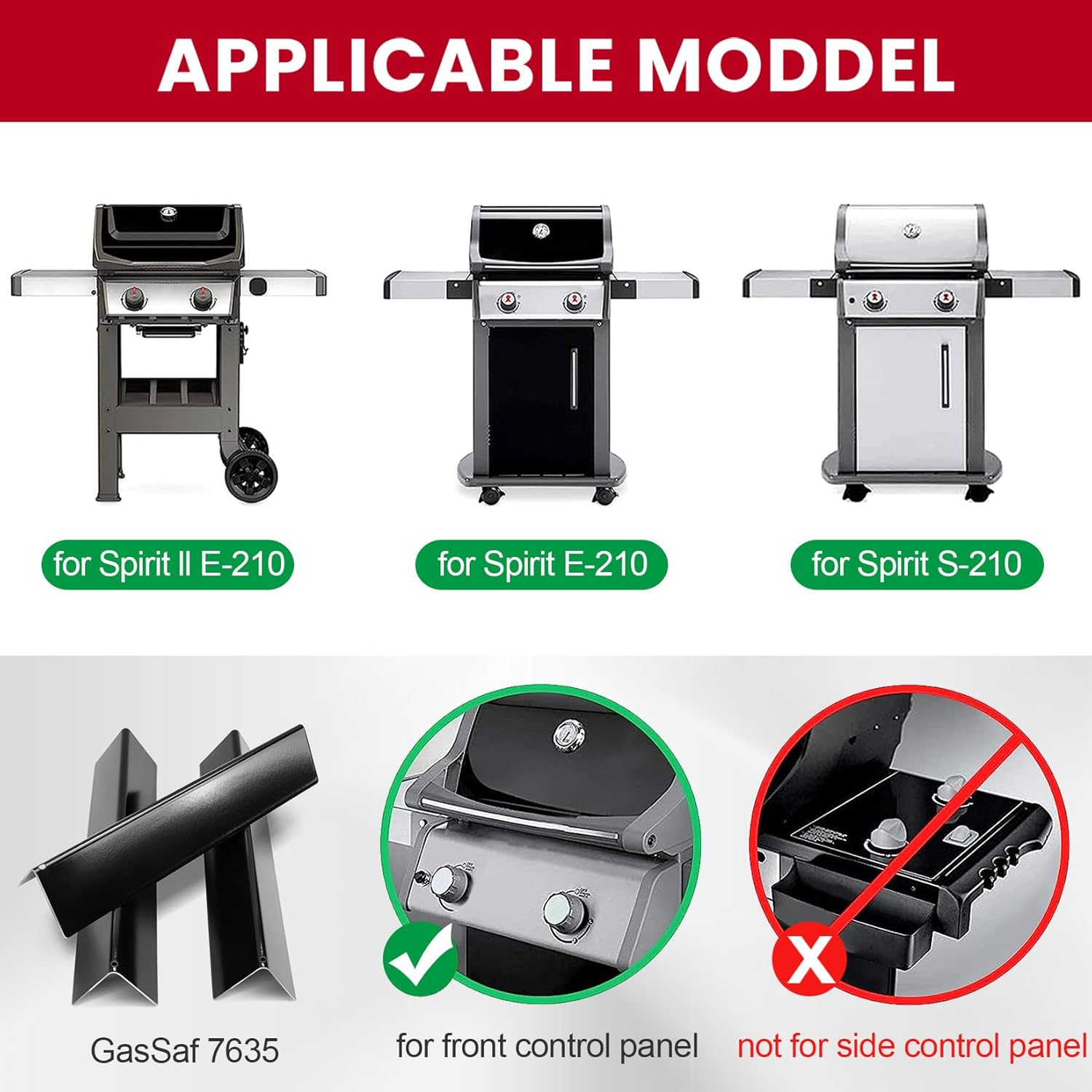 GasSaf replacement parts includes 3 pcs flavorizer bars, burner tube set and 2 grill grates in a set. 【17.5" Grill Grates for Weber 7637 】17.5" x 10.2" for each piece, 17.5" x 20.4" for 2 pcs. The package comes with 2 pcs grill cooking grates. GasSaf 7637 Spirit grates are made of cast iron material, retains heat superbly when you use them for Weber spirit 200 gas grill barbecue, please remember to season the grill grates thoroughly with oil before each use and after cleaning. 【15.3 Flavorizer Bars for Weber 7635】15.3" L x 3.5" W x 2.5" H, made of heavy duty porcelain enameled steel, the package comes with 3 pcs 15.3 inch flavorizer bars. Update your gas grill with 15.3" flavorizer bars to prevent food directly exposure to flame, heat your food evenly to get delicious taste, protect your grill burner from oil dropping, good protection parts for Weber Spirit 2 burners, extending the grill cooking life. 【Grill Heat Deflector 67060】measures 7-3/4" L × 4-1/2" W and stands 2-1/8" H. This heat deflector is designed specifically for Weber Spirit II 200 Series grills, features mounting foot tabs at each corner, 3 slotted vent openings on the slanted surface face, helping the drippings that are not vaporized by the flavorizer bars are funneled away from the burners, and drop into the disposable drip tray. Parts Kit fits for Weber Spirit 200 Series (with "Up Front" controls): Spirit S-210, S-220, E-210, E-220(model years 2013 and newer). Replacement for Weber Part Number: 7635, 67060, 7637. 【Grill Accessories for Weber Spirit】sold 3 grill flavorizer bars, 2 grill grates in a set and a grill heat deflector, one-stop shopping for weber spirit 200 grill replacement parts in a decent price to renew your grill again. Aftermarket replacements, please check and compare the size of the original parts before ordering.