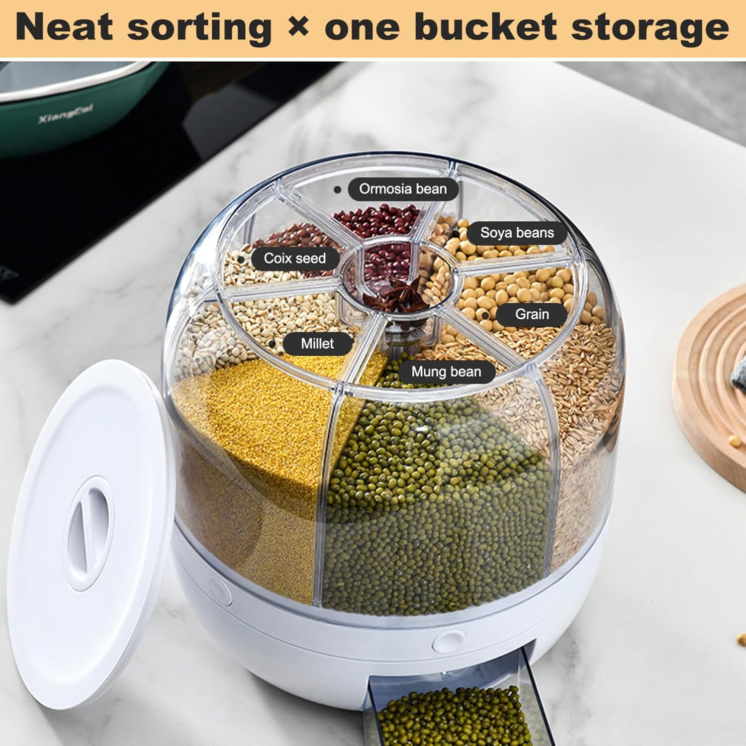 Description: Our 360 Rotating Rice Dispenser is a must-have for your kitchen! This rice storage container is made of food-grade PET and quality ABS material to ensure durability and longevity. The transparent design allows you to easily monitor the rice level, while the airtight lid keeps the rice fresh. With its sleek and modern design, this rice dispenser is not only functional but also adds a touch of style to your kitchen. Don't settle for a messy and cluttered pantry - get our 360 Rotating Rice Dispenser today! Features:. Rice Dispenser. -Color: White. -Material: ABS+PET+AS. -Size: 19x24x24 cm/7.48x9.45x9.45 inch. Note: Manual measurement, please allow slight errors on size. The colors may exist slight difference due to different screens. Package Including 1* Rice Dispenser.