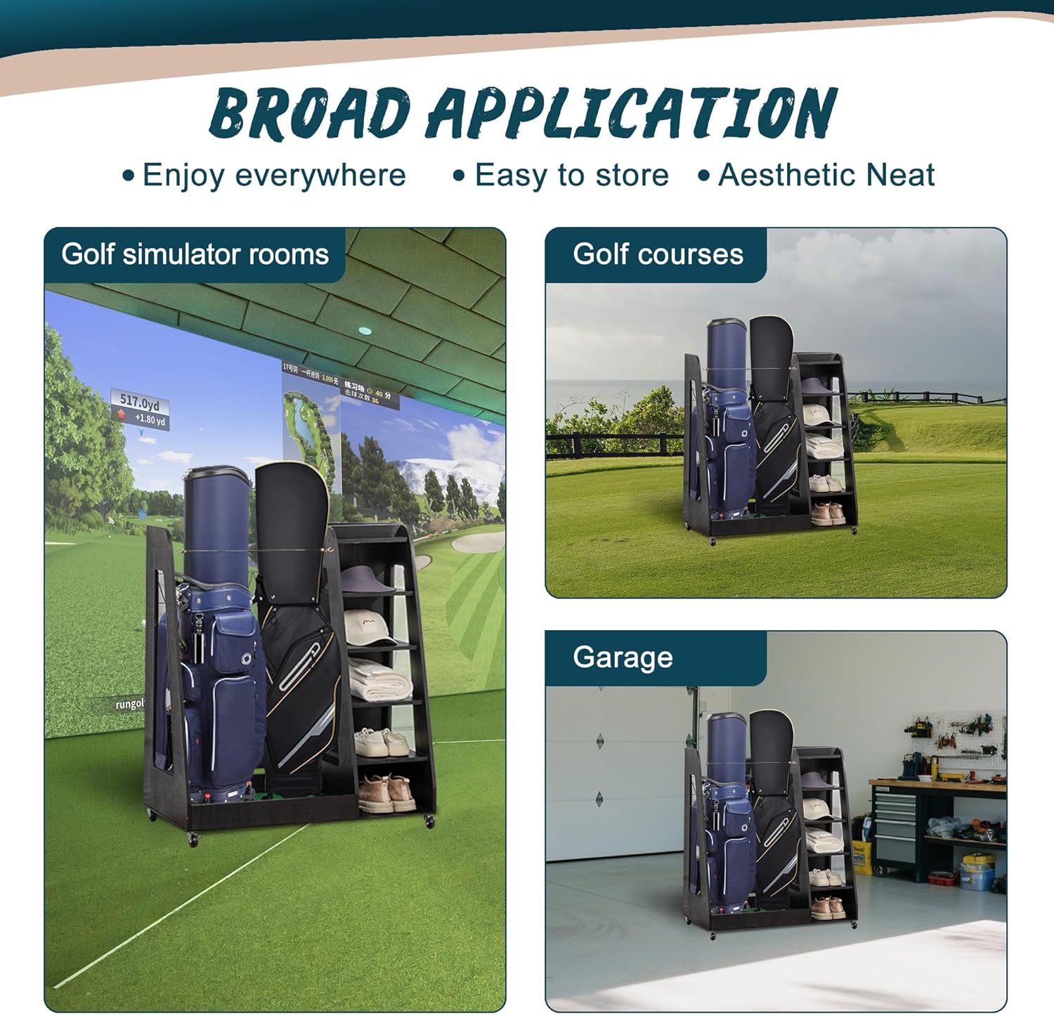 Premium Wooden Golf Club Rack Organizer for Garage, Basement & Car Trunk StorageUpgrade your golf gear storage with this premium wooden golf club rack, designed to keep your equipment organized, protected, and easily accessible. Crafted from high-quality wood with a sleek black finish, this heavy-duty organizer accommodates two full-size golf bags, multiple pairs of shoes, and all your essential accessories. Key FeaturesLarge Capacity Storage: Designed to hold up to 2 full-size golf bags, 5 pairs of golf shoes, and accessories such as balls, gloves, and tees. Keeps all your golf essentials neatly organized in one convenient location.Durable Wooden Construction: Built from premium wood with a sleek black finish, this organizer offers long-lasting durability and stability. Designed to withstand daily use and temperature changes in garages or basements.Versatile Multi-Functional Design: Spacious shelves and compartments accommodate various golf gear sizes, making it suitable for garage storage, basement organization, or even car trunk use.Smooth Mobility with Locking Wheels: Equipped with four 360° swivel wheels for easy movement. Locking mechanisms keep the rack securely in place once positioned. Product SpecificationsProduct Type: Golf Club Storage RackMaterial: WoodColor: BlackOverall Dimensions: 35.5"L x 18"W x 40"HWeight: 34.16 lbsCapacity: Holds 2 Golf Bags, 5 Pairs of ShoesMobility: 360° Swivel Wheels with LocksAssembly Required: YesRecommended Use: Garage, Basement, Shed, Car Trunk Storage