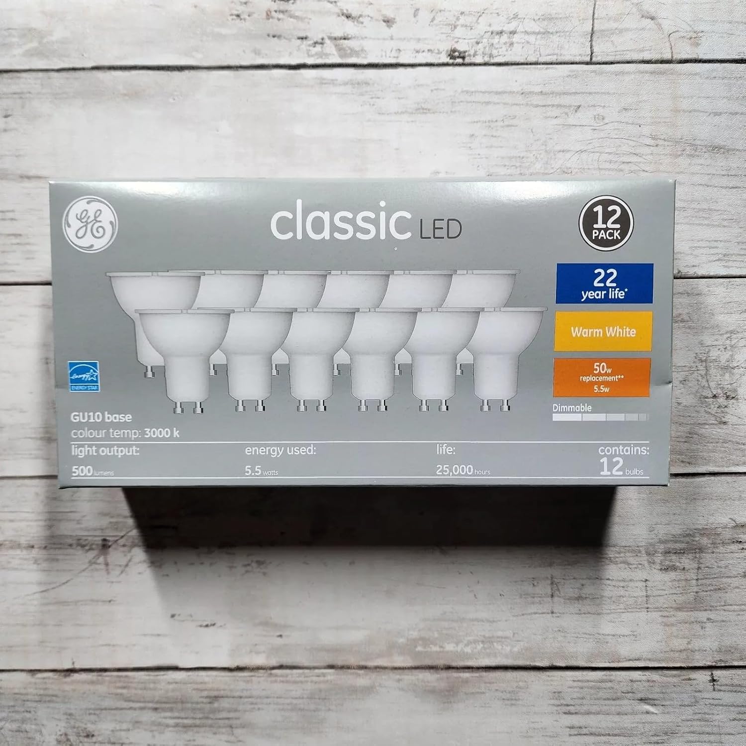 The product is a pack of 12 GE Classic LED light bulbs with a GU10 base. They emit a warm white light with 500 lumens brightness, equivalent to a 50W traditional bulb. Each bulb has a power consumption of 5.5W. The bulbs have a classic shape and finish, using LED technology for energy efficiency and long-lasting performance.