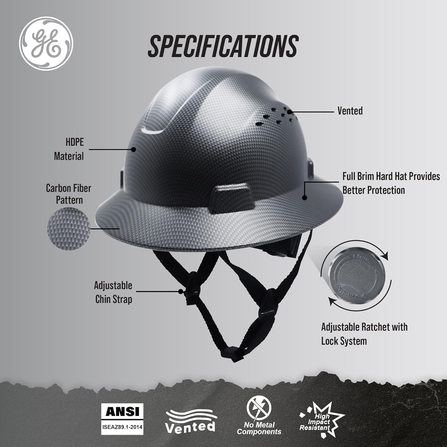 | Included Components | GE PPE - GH328CB HARD HAT FULL BRIM VENTED BLACK C |