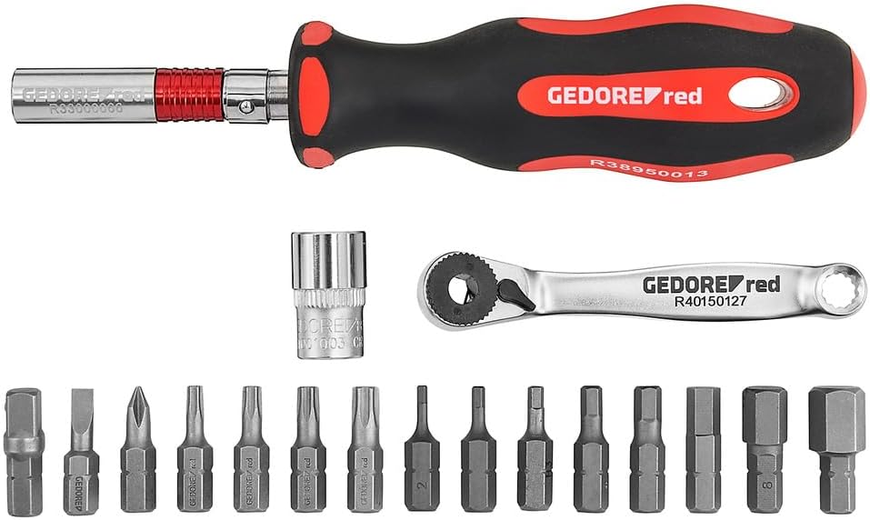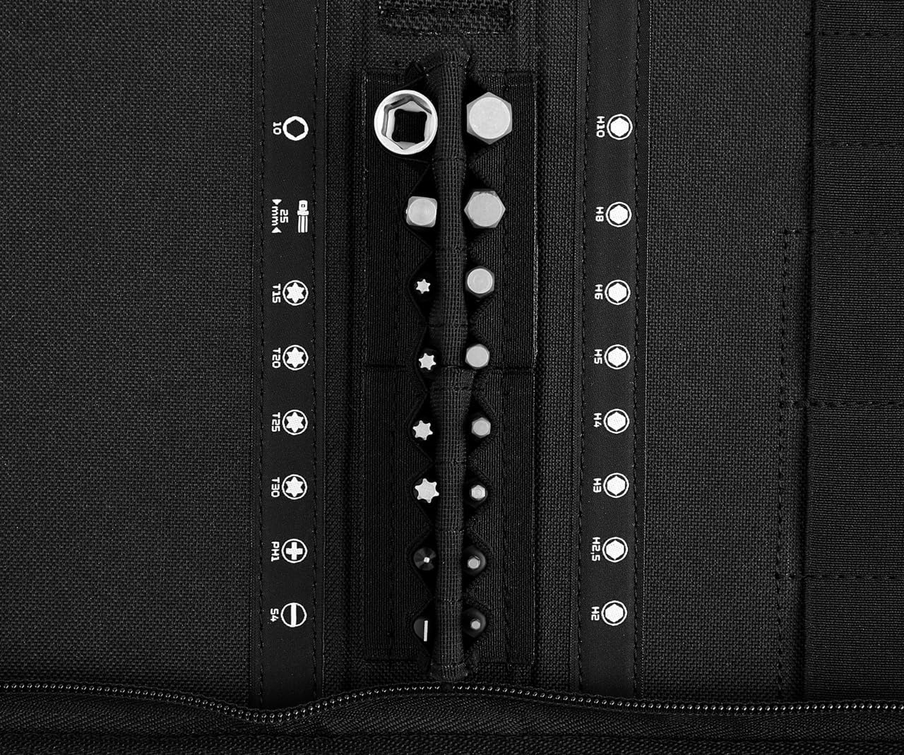 The professional bicycle tool kit is perfect for your mountain bike, racing bike or e-bike and includes a set of tyre irons, an adjustable spanner and a bit ratchet, and more. The kit includes the professional tools required to carry out standard repairs on your bike. Even poorly accessible nuts and bolts are not a problem, thanks to the thin adjustable cone spanner. You have a large selection of top-quality bicycle tools always within arm’s reach thanks to the practical tool bag with loop. The ergonomic bit ratchet makes work easier.