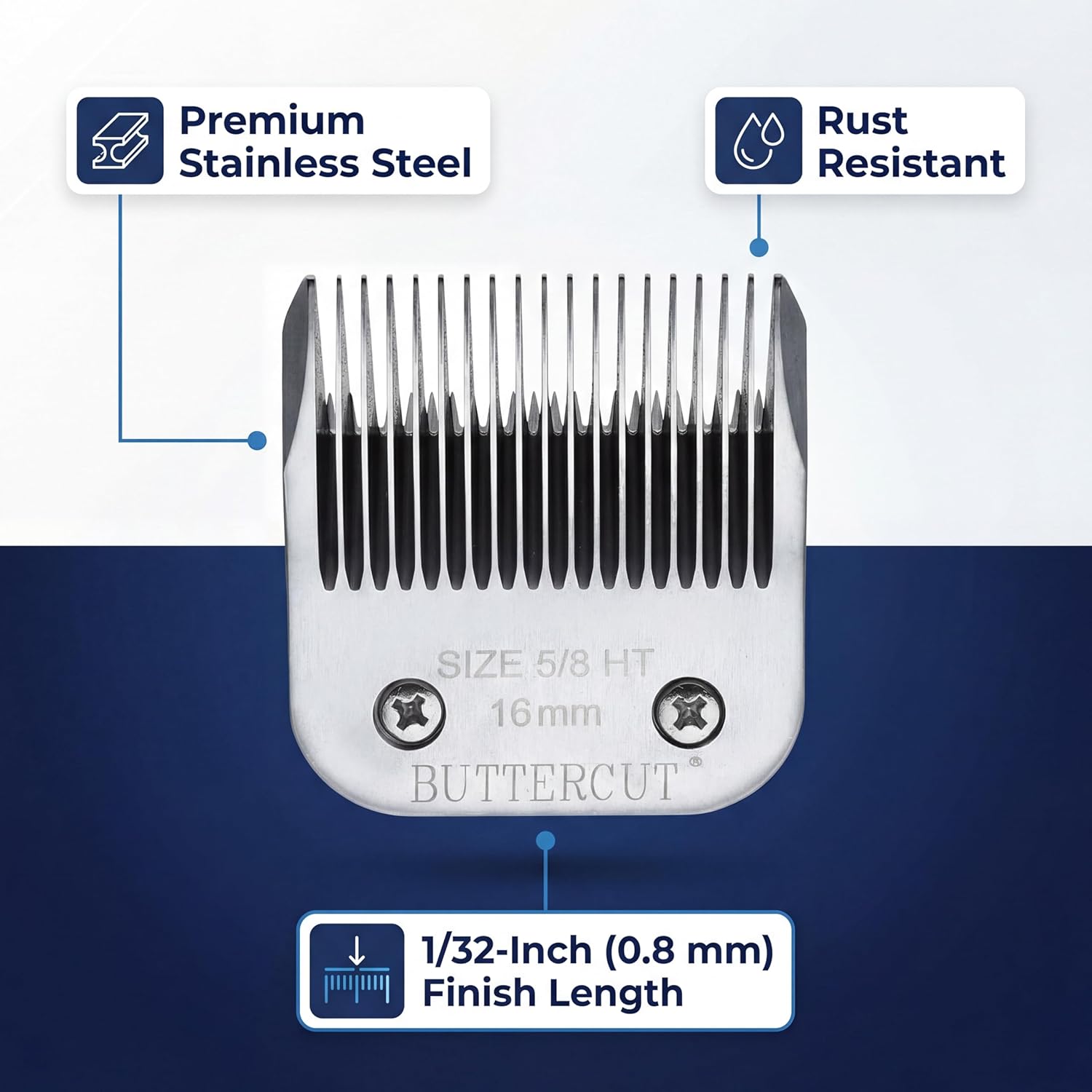 Geib Buttercut Stainless Steel Detachable Clipper Blade – Size 16/5/8 (5/8" Wide, Leaves 1/32" / 0.8 mm Cut) Give your grooming the professional edge with the Geib Buttercut Stainless Steel Detachable Clipper Blade. Precision-engineered for smooth, consistent results, this size 16/5/8 blade leaves a 1/32" (0.8 mm) finish—perfect for trimming, blending, and fine detail work on all coat types. Built from premium stainless steel, the Buttercut blade holds its edge longer, resists rust and corrosion, and delivers the durability professional groomers demand. Its universal A-5 detachable design ensures compatibility with popular clipper brands like Andis, Oster, and Wahl, making it a versatile addition to any grooming kit. The quick-release design makes blade changes fast and maintenance simple, saving time in busy salons and at-home grooming sessions alike. Trusted worldwide by professional groomers, kennels, and show handlers, the Geib Buttercut 5/8" blade is the reliable choice for achieving a flawless finish every time.