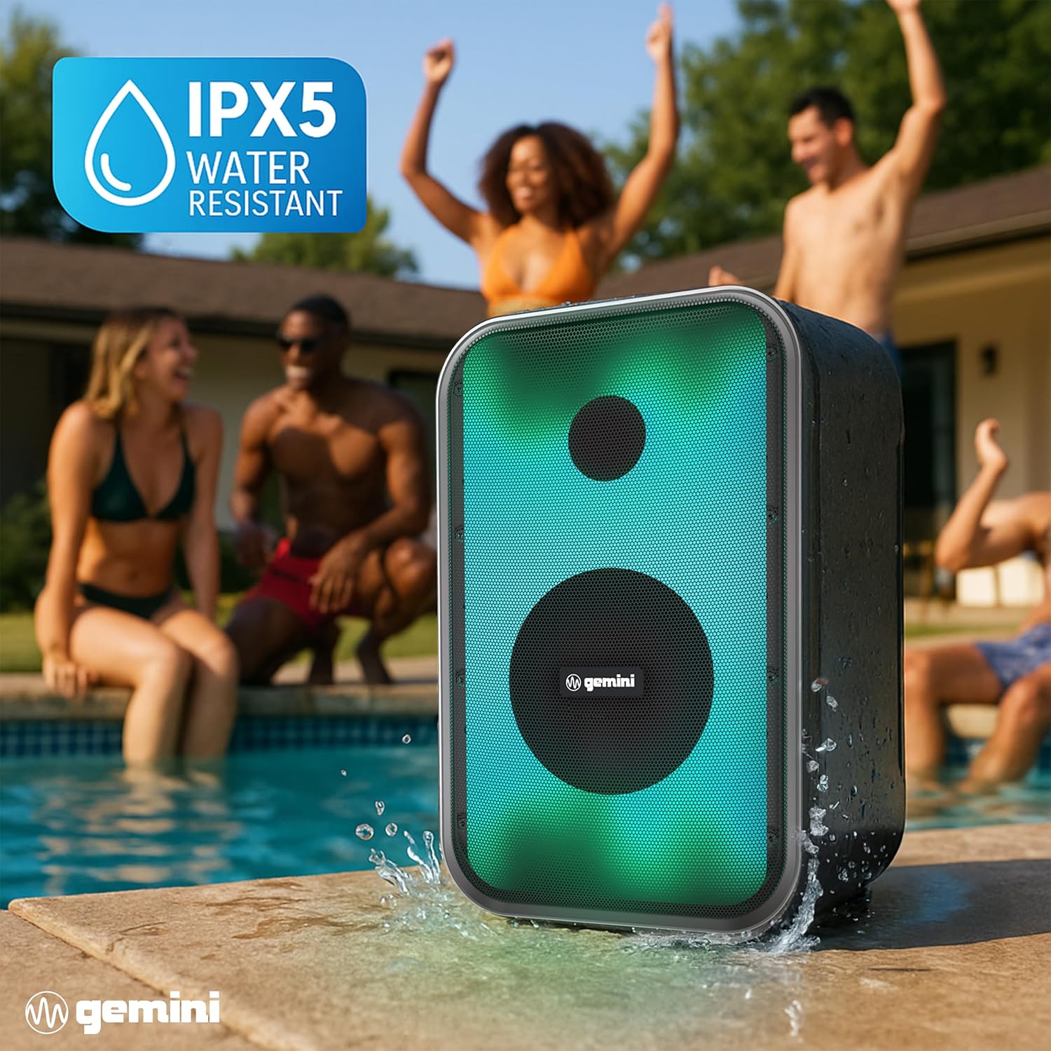 Gemini Portable Bluetooth Party Speaker with LED Lights, 6Hr Battery, IPX5 Waterproof, USB/AUX/FM Radio for Outdoor BBQ Pool Parties (GNV-60)