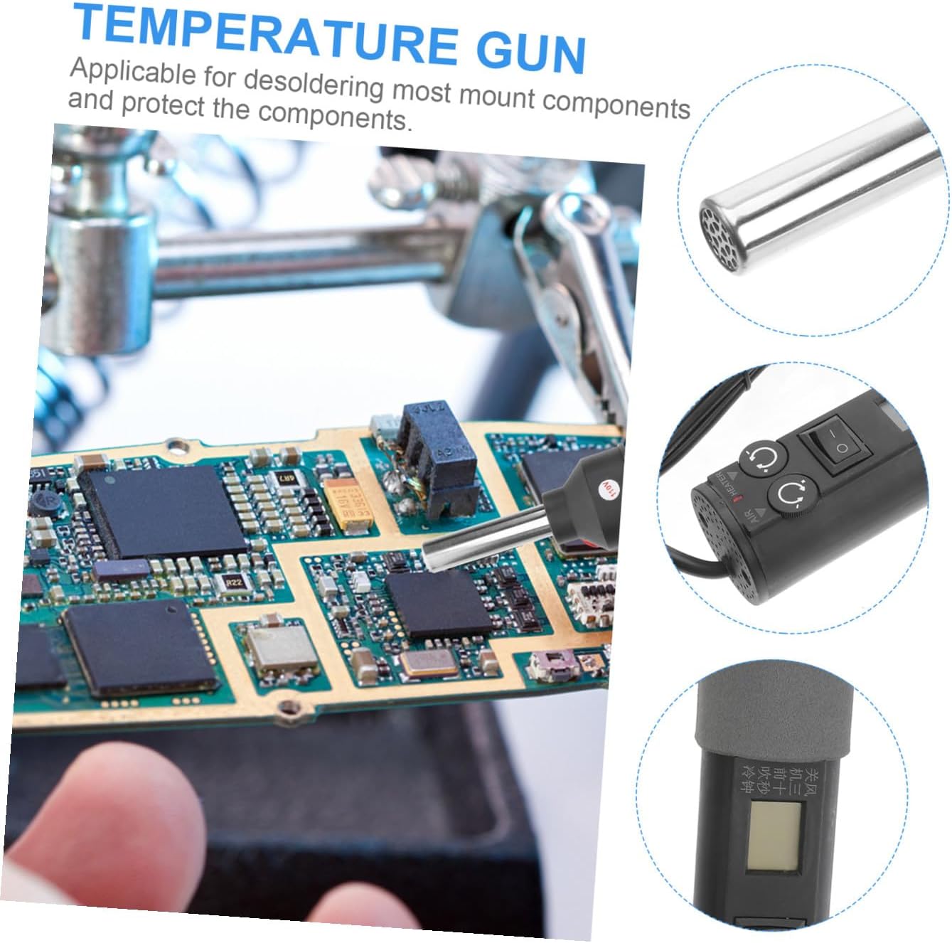 Package List 1 heat 4 x nozzle Features - Note: The plug has three plugs temperature - Rated Power: 450W temperature heat. - Color: Black air heat. - Size: 31.00X7.00X7.00cm/12.18X2.75X2.75in heater - Rated Voltage: 110V hot. - Material: Plastic and Metal. - Current: 7A. - Note: The Chinese and English logos are random. - Rotate the HEATER of the to adjust temperature. Clockwise for lower and anticlockwise for higher - Applicable for desoldering mount components and protect the components - Temperature and wind can be adjusted in a wide range - Small in size, portable and easy to use - Features wind, constant temperature, small temperature difference and quick temperature returningGoods Descriptiontemperature This item is an air heat.temperature heat Hot is a common fabrication technique for manufacturing smaller items.hot Please confirm the voltge of your area .heater It produces of hot air softening the blown parts.air heat Note: This item is only for 110V, not for . It can be used for melting rust materials, softening paint and plastic, removing the sticker, bending the plastic tube, changing the floor tile, repairing the mobile phone and so on