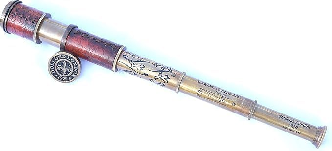 Discover the allure of vintage exploration with our 12" Handcrafted Brass Antique Adjustable Telescope. This exquisite piece features a beautifully polished brass finish and a classic single-barrel design, reminiscent of historic pirate spyglasses. The telescope comes with a luxurious stamped leather case, adding an extra layer of sophistication and protection. Adjustable for precise focusing, this telescope combines both form and function, making it an elegant addition to any home or office decor. Perfect for those who appreciate unique, antique-inspired items, this telescope not only serves as a decorative element but also as a nod to the golden age of exploration.