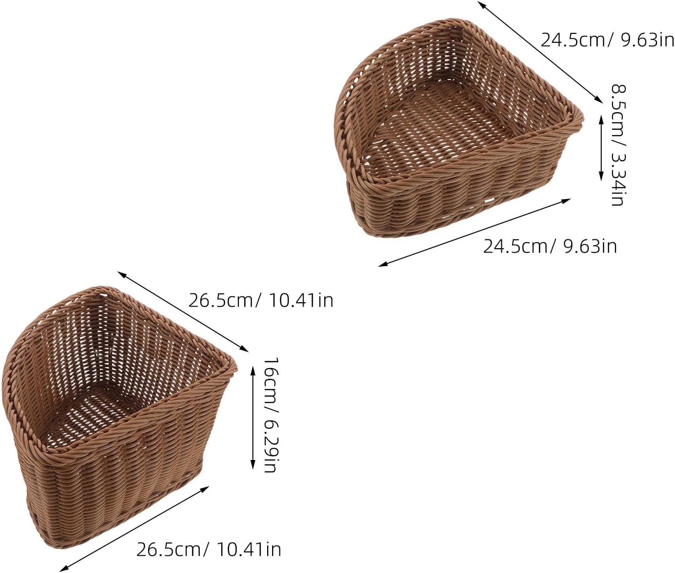 Description Experience effortless organization with plastic rattan corner laundry baskets, as woven corner fruit storage triangle baskets. The half round triangle basket for corner storage maximizes wardrobe space, serving as a side table organizer and a triangle woven basket tray. Its imitation rattan woven design merges durability with modern aesthetics, ideal for quick grab-and-go storage. Features -Color:Light Brown -Material:Plastic -Size:24.50X24.50X8.50cm/9.63X9.63X3.34in -Size:26.50X26.50X16.00cm/10.41X10.41X6.29in -Cornerfocused organization: utilizing triangle woven corner laundry baskets, you can transform unused wardrobe corners into functional storage, reducing clutter and improving accessibility -Resilient & lightweight build: each imitation rattan woven basket is made of plastic, offering a combination of lightness and toughness for stressfree everyday use and maintenance -Adaptable set design: plastic rattan corner baskets allows for different configurations to suit changing household storage needs, from clothing to accessories -Effortless assembly: triangle countertop woven storage trays snap together without any tools, providing simple installation so you can instantly optimize your closet organization - : the halfround woven corner caddy storage basket features an imitation rattan appearance, blending harmoniously with diverse home styles and adding elegance to functional spaces