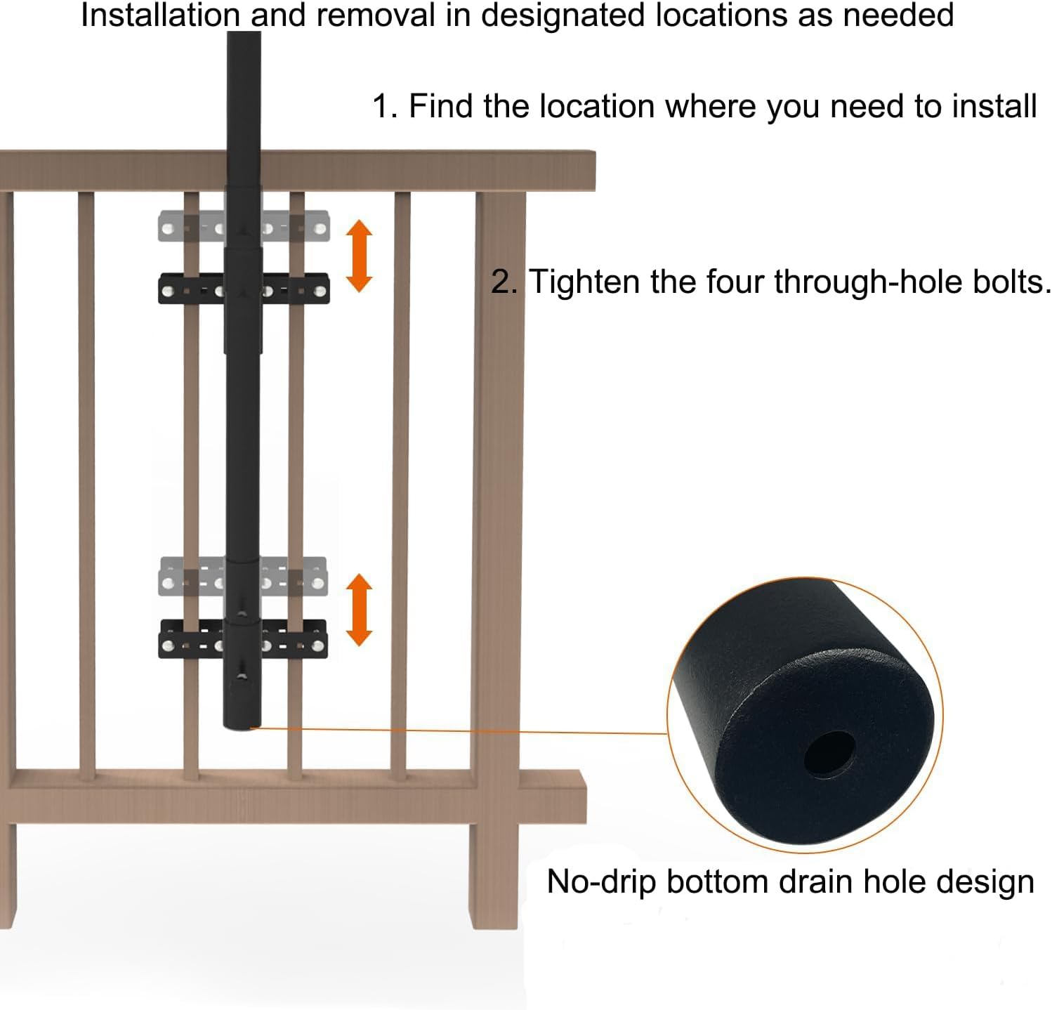 This deck umbrella mount stand are made of durable metal with a high-temperature powder-coated surface that is waterproof and rust-resistant; to install, simply attach the patio umbrella holder around the railing with straight-through bolts and tighten the knobs to lock the umbrella securely in place,This patio umbrella holder is suitable for 1-1 3/4 inch diameter umbrella pole,Patent No:222751582U