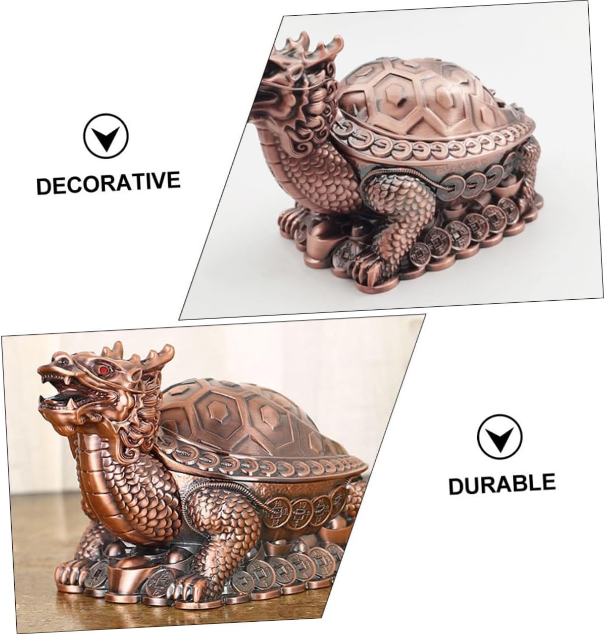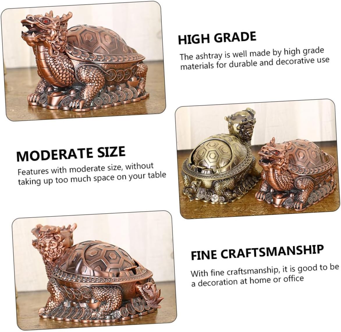 Package Include 1 x ashtray Characteristics - Size: 19.40X10.20X10.20cm/7.62X4.01X4.01inch Desktop Ashtray. -Product Info:Windproof ashtray - Material: Zinc Alloy Vintage Ash Holder. - Unique design makes it very creative and decorative to display on your table Dragon Turtle Cigarettes Ashtray. - Its material is safe and zinc alloy, very and safe to use Ashtray Ornament. - The ashtray is well-designed, which is convenient for placing cigarettes and the bottom is stable Household Ashtray. - Creative and stylish design makes it fashionable and delicate, also suitable to be sent to family, friends, colleague, neighbor, etc Ashtray Decor. - Creative and vintage dragon turtle shape design makes it not only a smoke ash container but also an ornament Metal Ashtray.Goods DescriptionHousehold Ashtray It is a good gift for giving father.Ash Tray This is not only an ashtray but also a great home or office ornament.Desktop Ashtray Moreover, the ashtray can be a great gift for your friends who are smoking.Retro Ash Holder With special dragon turtle shape design, it owns unique decoration style and effect