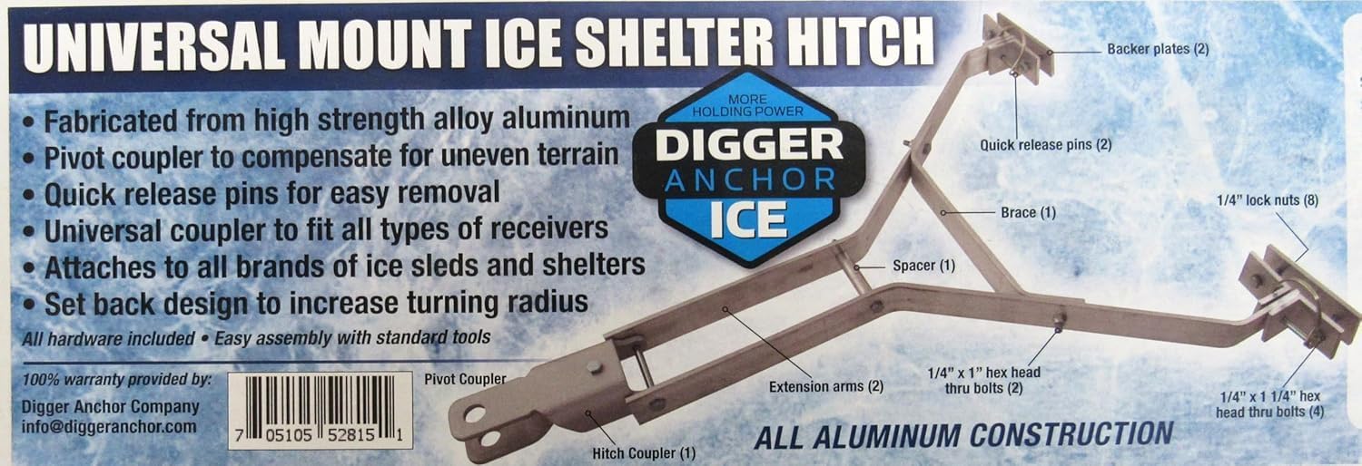 The Digger Front Tow Hitch can be easily installed on all brands of ice sleds. Whether your sled comes with pre-molded hitch points or if it is a flat front design. Fabricated from high-strength alloy aluminum. Lightweight yet very durable. The Pivot coupler allows for the transfer of motion in all types of terrain. Hardware is supplied and comes with quick-release pins for ease of removal and storage. This hitch mounts to all ice sleds and portable ice shacks. High-strength alloy aluminum construction with pivot coupler.