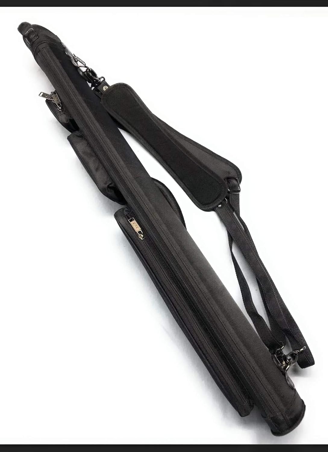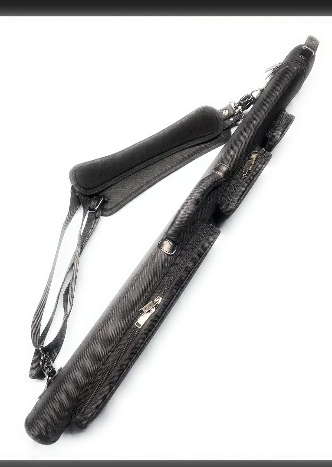 All black 3 butt 4 shaft 3x4 cue case Thick blue interior lined dividers Adjustable comfort backpack straps Top handle Side handle Case will accommodate butts and shaft up to approximately 32 inches and can be stored in either direction 3 pockets dimensions are as followed are in inches and are approximate Large 16 x 4 Medium 6 x 4 Small 3 1/4 x 3 1/4 The cases total exterior dimensions are approximately in inches 36 long, 7 wide, 6 deep Case weighs in at a nice light 3 1/2 pounds