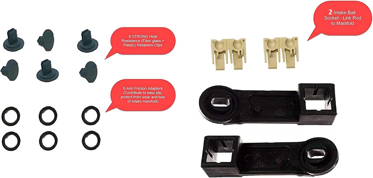 A common failure inherent to the intake manifold of OM642 V6 CDI / CRD engines is for breakage of the actuating mechanisms on the intake swirl flap system. The plastic material used in the construction of the intake manifold is the main source of the problem. These swirl flaps help create better torque low down and enhance fuel economy. However the material of this lever that controls the swirl flaps has been incorrectly specified. Over time this less robust plastic material cannot withstand the constant heat cycles and mechanical stresses, therefore embittering and weakening the material leading to inevitable failure. Our Premium intake manifold repair kit is the only solution which solves all of these issues during your first and only repair... One of the faults of the OM642 diesel engine is the defective intake manifold flaps, they stop working due to the wear of the chuck fixing clips, the thrust guide of the connection to the flaps, and the seat plates on the dampers levers. The cause of wear is the material from which the vortex dampers drive system itself is made - plastic. Over time, the connection points of the linkage and the flaps wear out, this leads to a malfunctioning system of the vortex dampers of the manifold. Engine control module stored pending codes for Intake Manifold Air Flap or Runner Control System problems, in order to fix this problem need a complete replacement of the "Intake Manifold Assembly"...... but by using our new repair kit, specially designed to save you money, you will not have to replace complete Intake Manifold Assembly. Even if the Swirl Valve Arms on your manifold are very worn, replacement of just the Connecting Rod usually restores full function.