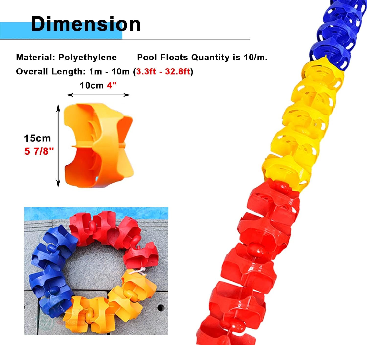 Use this floating rope to record dangerous areas to ensure the safety of swimming, which will make the swimming pool very interesting.✔ Package Contents :1 × Pool Rope Float✔ Specification:- Material: Polyethylene- Rope Material : Nylon Rope/ Steel Wire Rope- Single Float Width : 10 cm/ 4"- Single Float Length: 15 cm/ 5 7/8"✔ Feature:- It can last for multiple seasons.- Easy to split lane lines.- Durable and lightweight polyethylene.- Can withstand chemicals in the swimming pool.- Separate the shallow and deep end of the pool.- Separate indoor and outdoor pool race/practice lap lanes.✔ Kind Reminder:- Minor errors can occur due to different batches and manual measurements. Thank you for your understanding.- There may be some differences between the image and the product due to display and lighting reasons, please refer to the actual product.✔ Satisfactory Service :- We provide with you are the best trusted service. Any questions, please do not hesitate to contact us, we will serve you 24 hours.
