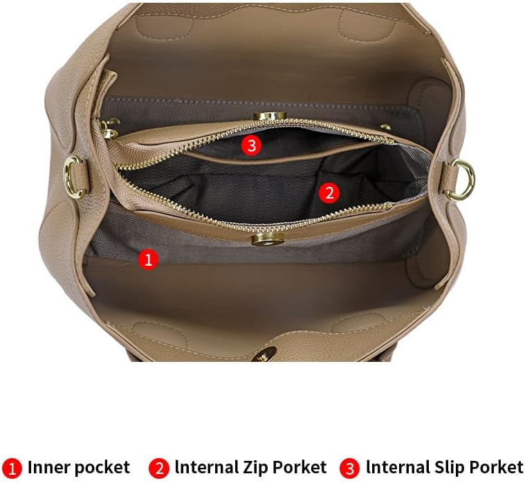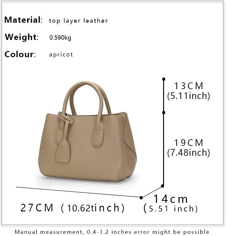 1. Premium Material & Quality Craftsmanship Crafted from top - layer leather, this handbag boasts a luxurious texture and exceptional durability. The fine - grained leather not only looks elegant but also ages beautifully, ensuring it remains a stylish companion for years. Every stitch and detail reflects meticulous craftsmanship, making it a high - end accessory worthy of your collection. 2. Practical Size & Lightweight Design With dimensions of 27CM (10.62inch) in length, 14CM (5.51inch) in width, and 19CM (7.48inch) in height, plus a weight of just 0.590kg, it’s perfectly sized for daily use. It can hold your essentials like phone, wallet, cosmetics, etc., without being bulky. Whether you’re heading to work, a date, or a weekend outing, it fits seamlessly into your lifestyle. 3. Thoughtful Internal Structure The well - designed interior features multiple pockets: an inner pocket, an internal zip pocket, and an internal slip pocket. You can neatly organize your items—keep keys in the slip pocket, cash in the zip pocket, and frequently - used cards in the inner pocket. No more rummaging around; everything has its place for easy access. 4. Stylish Aesthetic & Versatile Color In a charming apricot shade, this bag adds a touch of sophistication to any outfit. The classic handbag shape with elegant handles suits both casual and formal looks. Whether paired with jeans and a blouse or a little black dress, it elevates your style effortlessly, making you stand out in any crowd. 5. Secure & Convenient Hardware Equipped with high - quality metal hardware, including clasps and zips, it ensures the security of your belongings. The smooth - operating zips and sturdy clasps are not only functional but also add a touch of luxury. They’re built to last, providing you with a reliable and stylish bag for all your adventures.