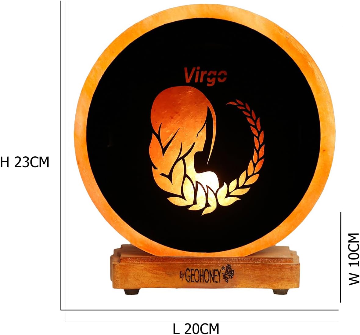 Illuminate your space with this stunning Virgo-themed Himalayan salt lamp by GEOHONEY. Standing 9 inches tall with a solid wooden base, this artistic lamp features an elegant silhouette of the Virgo zodiac symbol surrounded by a decorative wheat wreath design. The carefully carved salt crystal emits a warm, amber glow when lit, creating a serene atmosphere perfect for meditation or relaxation. Weighing approximately 13.2 pounds, this substantial piece serves as both a functional lamp and an eye-catching decorative element. The circular design measures about 7.9 inches in diameter, making it an ideal size for bedside tables, desks, or meditation spaces. The contrast between the dark wooden base and the glowing salt crystal creates a striking visual effect, while the branded GEOHONEY base provides stable support. This unique zodiac salt lamp makes a thoughtful gift for the Virgo in your life or anyone who appreciates distinctive home decor with an astrological theme.