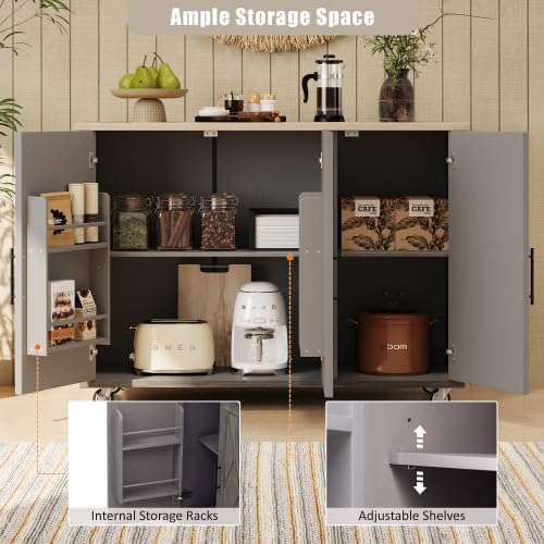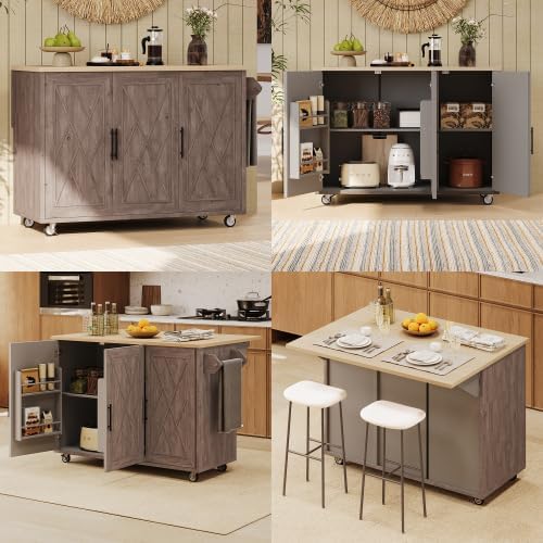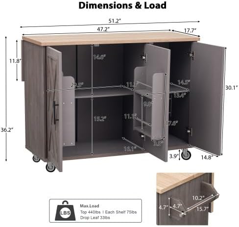 This ranch-style indoor kitchen island can bring classic style and elegance to your kitchen space. It also provides great convenience for your indoor storage. This product is mainly made of environmentally friendly medium-density fiber materials, with gray leather material on the desktop surface, and can be used for a long time. The whole geometric striped wood grain look is very expensive and will make your kitchen eye-catching. In terms of storage space, this kitchen cart has a large 47-inch wide work surface, drop leaf design, side towel rack, two internal storage racks and adjustable shelves so that you can arrange different items freely. At the bottom of the product, there are four wheels, two of which are lockable, allowing you to move and stop freely. If you need stability, you can also replace the wheels with wooden feet. With this kitchen island, you no longer have to worry about cluttered kitchen space.