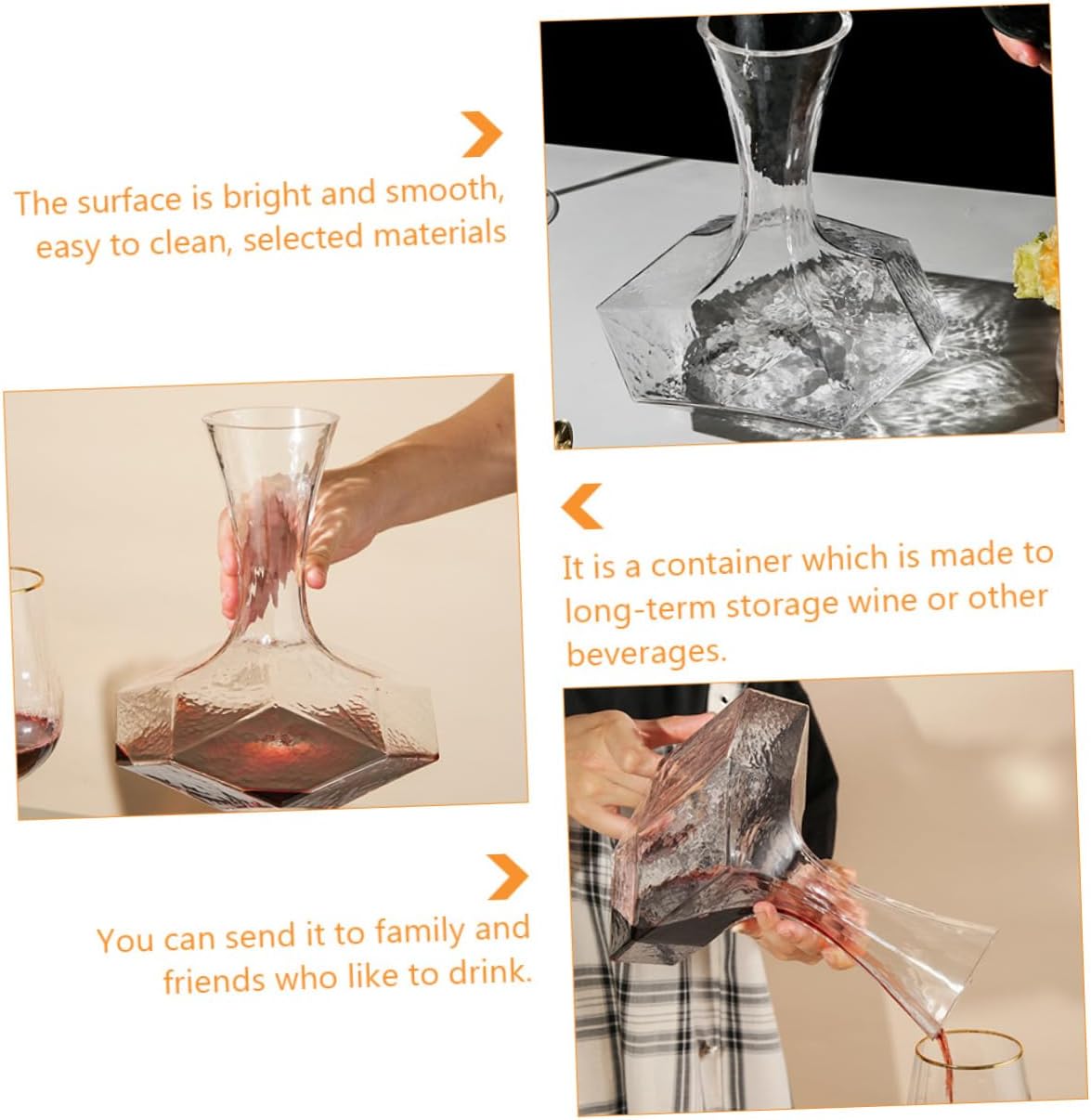 Package Include 1 x Decanter Features - Size: 21.80X19.80X19.80cm/8.57X7.78X7.78in Inclined Mouth Decanter. - Color: Transparent Handheld Wine Decanter. - Material: Glass Large Decanter. - Fine workmanship, clear and transparent, full of high-end atmosphere, ensuring practicality and durability Glass Wine Decanter. - The decanter is very suitable to the flavor of your favorite wine. It can the purity, aroma and taste of your favorite red or white wine Decanter. - The glass decanter is very light and easy to pour. You can pour the wine into a glass bottle and then into the bottle Fast Wine Decanter. - This makes the wines you will like have a softer, richer taste and texture. Please entertain your wine connoisseur friends, colleagues and family with a beautiful decanter Brandy Decanter. - The design is simple and practical, giving you a user experience, and the funny design, fashionable and elegant, will your drinking experience Fast Decanter.Goods DescriptionBrandy Decanter Use this wine decanter to provide your distinguished guests with wines! Wine decanters and glass bottles can purify your favorite red or white wine and add flavor and flavor to it.Glass Wine Decanter Designed for wine lovers.Wine Container Made of glass, transparent and