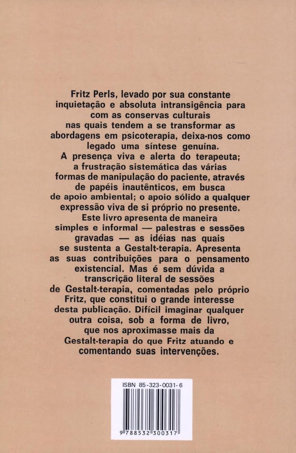 Fritz Perls, com sua constante inquietação e intransigência, deixa-nos como legado esta síntese genuína de sua grande criação, a gestalt-terapia. O livro apresenta de maneira simples e informal - palestras e sessões gravadas - as idéias nas quais se sustenta a gestalt-terapia. Difícil imaginar algo que nos aproxima-se mais da gestalt-terapia do que o próprio Perls atuando e comentando suas intervenções. Editora : Summus Editorial; 11ª edição (1 janeiro 1977)Idioma : PortuguêsCapa comum : 376 páginasISBN-10 : 8532300316ISBN-13 : 978-8532300317Dimensões : 20.8 x 13.8 x 2 cm Read more