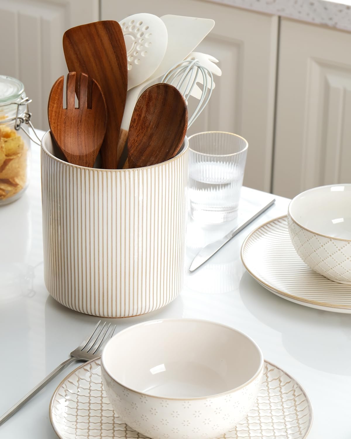 • [Elegant Kitchen Utensil Holder] Designed with ridged texture, this utensil holder looks just modern & elegant standing on your kitchen counter, fits into your kitchen well