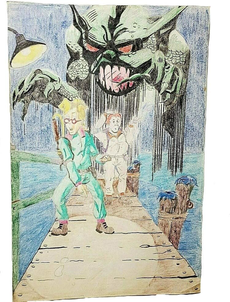 Ghost Busters Cartoon Series Hunting Ghosts on Dock Dimensions: 12" X 18" Features: Signed (Me, Artist) Medium: Colored Pencil, Crayons, Pencil, Graphite Region of Origin: US Date of Creation: 1989 to 1990 Size Type: Large Listed By: Artist Style: Comic Quantity Type: Single-Piece Work Color: Colored Pencil, Crayons on White Paper Subject: Animation Originality: Original, Hand Sketched from Cartoon Series.
