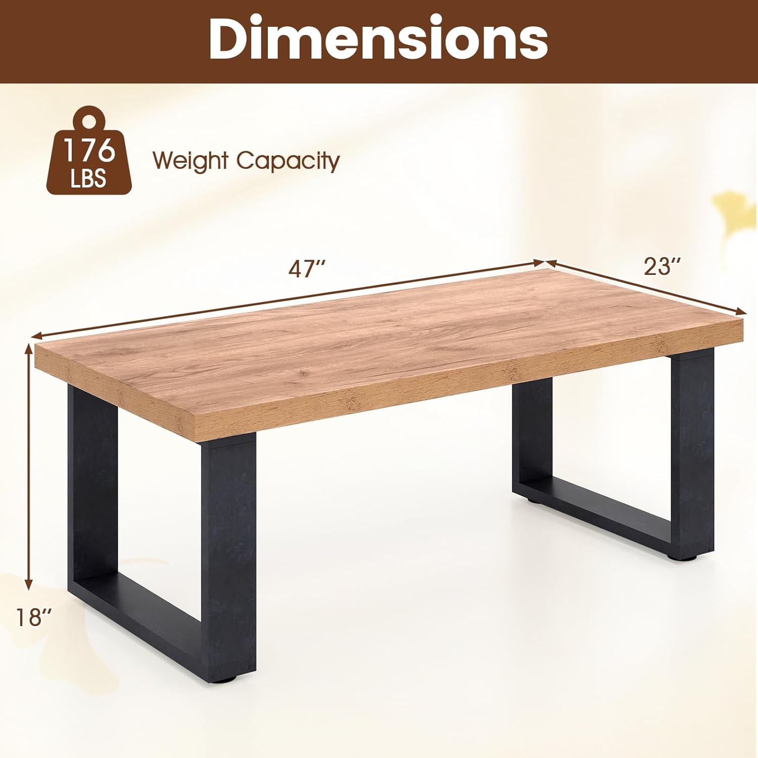 Description:Unveil the epitome of design and durability with our rustic-modern coffee table! Boasting a sturdy 1.8" thick scratch-resistant top, this stylish centerpiece supports up to 176 lbs, making it the perfect blend of functionality and chic. Its generous 47" x 23" surface provides ample space for all your essentials, from snacks to style accents, while seamlessly adapting to any activity. With ample under-table clearance, it even accommodates robot vacuums, ensuring your living space remains pristine. Refined with a rustic wood finish and a sleek matte-black frame, it’s not just a coffee table—it’s a statement piece that enhances any space, be it contemporary or traditional. Transform your living area into a model of style and efficiency. Why wait? Add this charming masterpiece to your home today!Features:47" x 23" spacious tabletop for decorations, magazines, cups and snacksWith textured wood grain for a natural and rustic feelOurs features a 1.8" thickened tabletop for a longer service life than othersRobust construction can support up to 176 lbsNon-slip foot pads for added stability Ample clearance under table for maximum convenienceVersatile and stylish for your living roomsAssembly neededSpecification:Color: Oak + BlackMaterial: Engineered WoodOverall Dimensions: 47" x 23" x 18" (L x W x H)Weight Capacity: 176 lbsNet Weight: 40 lbsPackage Includes:1 x Coffee Table1 x User Manual