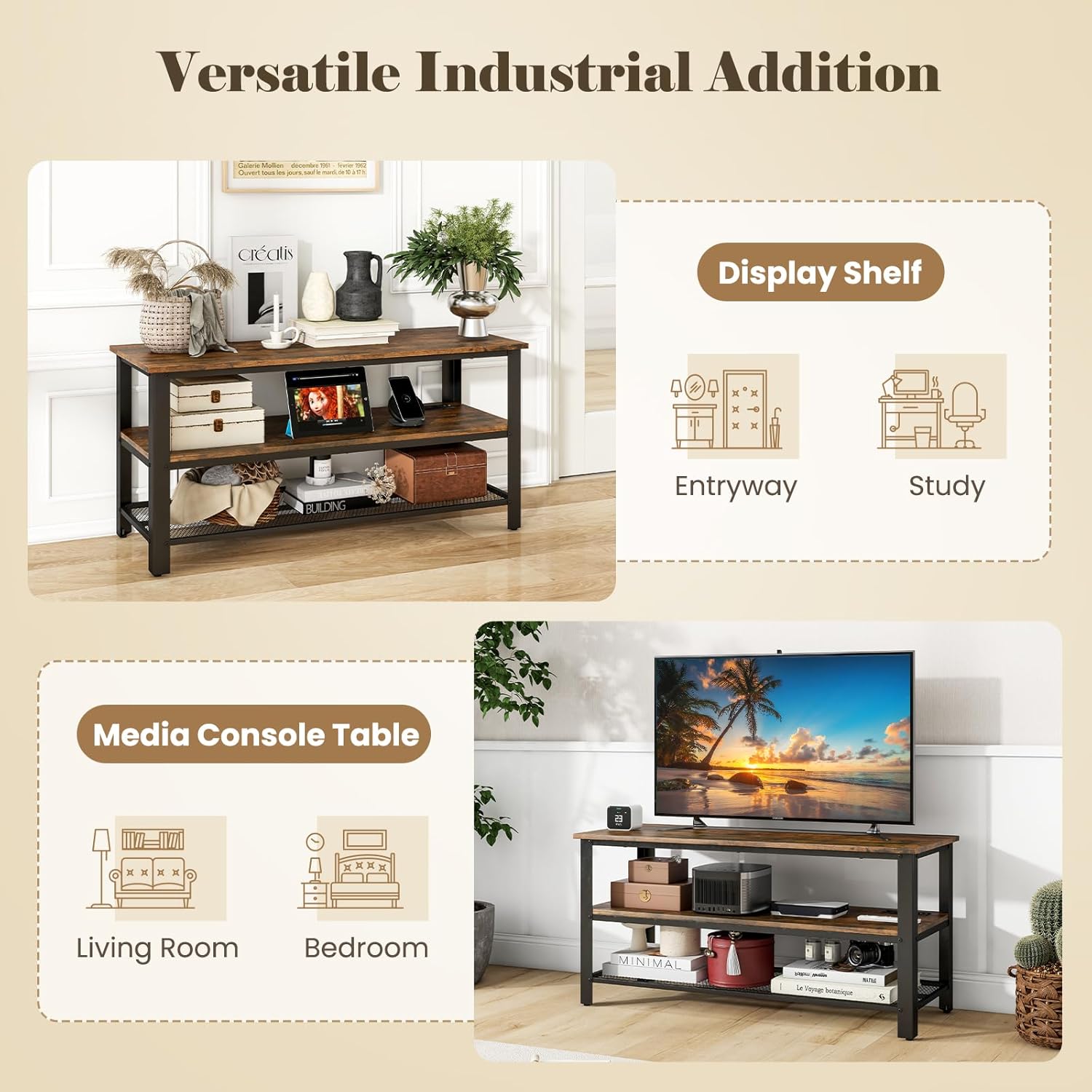 Description: Enhance your entertainment setup with our versatile TV stand. Designed to accommodate TVs of 40”, 48”, or 50”, this TV stand offers ample space for media equipment. Stay organized with 2 convenient storage shelves, keeping your essentials easily accessible and your space tidy. Power up your devices effortlessly with 2 AC outlets, 1 USB A ports, and 1 USB C port integrated into the console table. The sturdy metal frame supports up to 340 lbs, adding an industrial flair to your decor, while adjustable foot pads ensure stability. Embrace the versatility of this multifunctional piece that seamlessly fits into any room – be it a living room centerpiece, a stylish bedroom media hub, or an elegant entryway console. Unleash the full potential of your entertainment space with this modern and functional TV stand. Features: As a perfect platform for your screen TVs up to 50 inches Has a built-in charging station that features the ETL certification 3-layer storage solution with a wide tabletop and 2 open shelves Robust TV stand consists of reinforced metal and anti-crack boards Always stand stably thanks to the adjustable foot pads Multi-purpose choice to serve as a display shelf as you want Versatile industrial addition for your living room, entryway, study, and more Specifications: Color: Rustic Brown & Black Material: Engineered Wood, Metal Overall Dimensions: 43.5” x 16.5” x 21”(L x W x H) Distance Between Shelves: 7.5”, 7” Height off the Ground: 2.5” Load Capacity of Tabletop: 135 lbs Load Capacity of Middle Shelf: 135 lbs Load Capacity of Bottom Shelf: 70 lbs Length of Power Cord: 4.7 ft Net Weight: 37 lbs Package Includes: 1 x TV Stand 1 x User Guide Why You Choose Our TV Stand? √ It comes with a charging station that includes 2 AC outlets 2 USB ports. √ It features a wide desktop and 2 storage shelves for ample storage space.