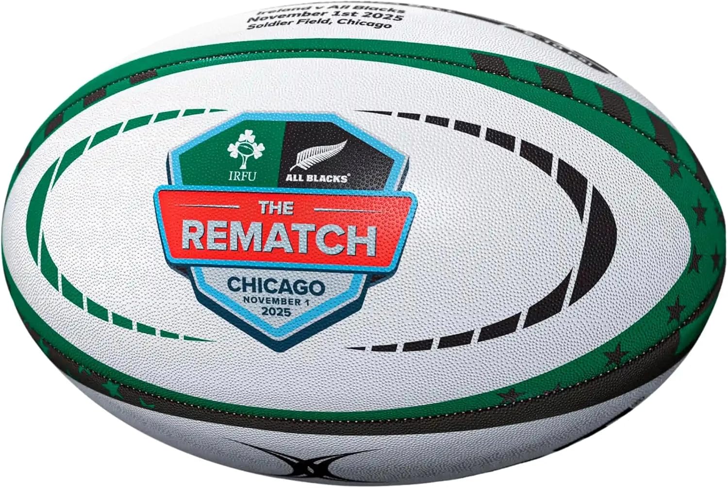 Own a piece of rugby history with the Gilbert Ireland v New Zealand Gallagher Cup 2025 Replica Ball, modeled after the same ball used on the pitch for The Rematch at Soldier Field in Chicago. As Ireland and the All Blacks face off once more on November 1, 2025, this rugby ball brings the intensity, pride, and tradition of one of rugbys greatest rivalries straight to your hands.
