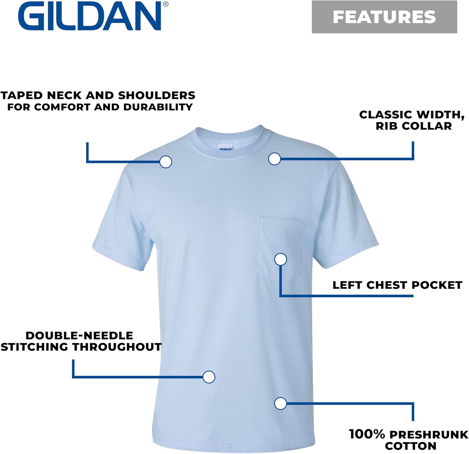 Upgrade your wardrobe with the Gildan Men's T-Shirt, Adult Ultra Cotton Tee with Pocket, available in multipacks of 1, 3, 6, and 10. Made from 6 oz., 100% USA cotton, these tees offer exceptional comfort and durability. The fabric blend for Ash Grey is 99% cotton, 1% polyester; Sport Grey is 90% cotton, 10% polyester; and Safety Green and Safety Orange are 50% cotton, 50% polyester. Designed for ultimate comfort, the t-shirt features double-needle stitching throughout, taped shoulder-to-shoulder, a 7/8" collar, and a convenient five-point left-chest pocket. The tear away label ensures irritation-free wear. Available in 15 vibrant colors and sizes ranging from S to 5XL, these t-shirts are perfect for everyday wear, work wear, and casual outings. They are also ideal for layering or wearing on their own. Gildan’s manufacturing process utilizes 45% renewable energy, and the t-shirts are made with sustainably and fairly grown USA cotton. Additionally, Gildan’s Community Investment Program supports education, the environment, humanitarian aid, and active living in the communities they serve. Elevate your style with these versatile and high-quality tees from Gildan.