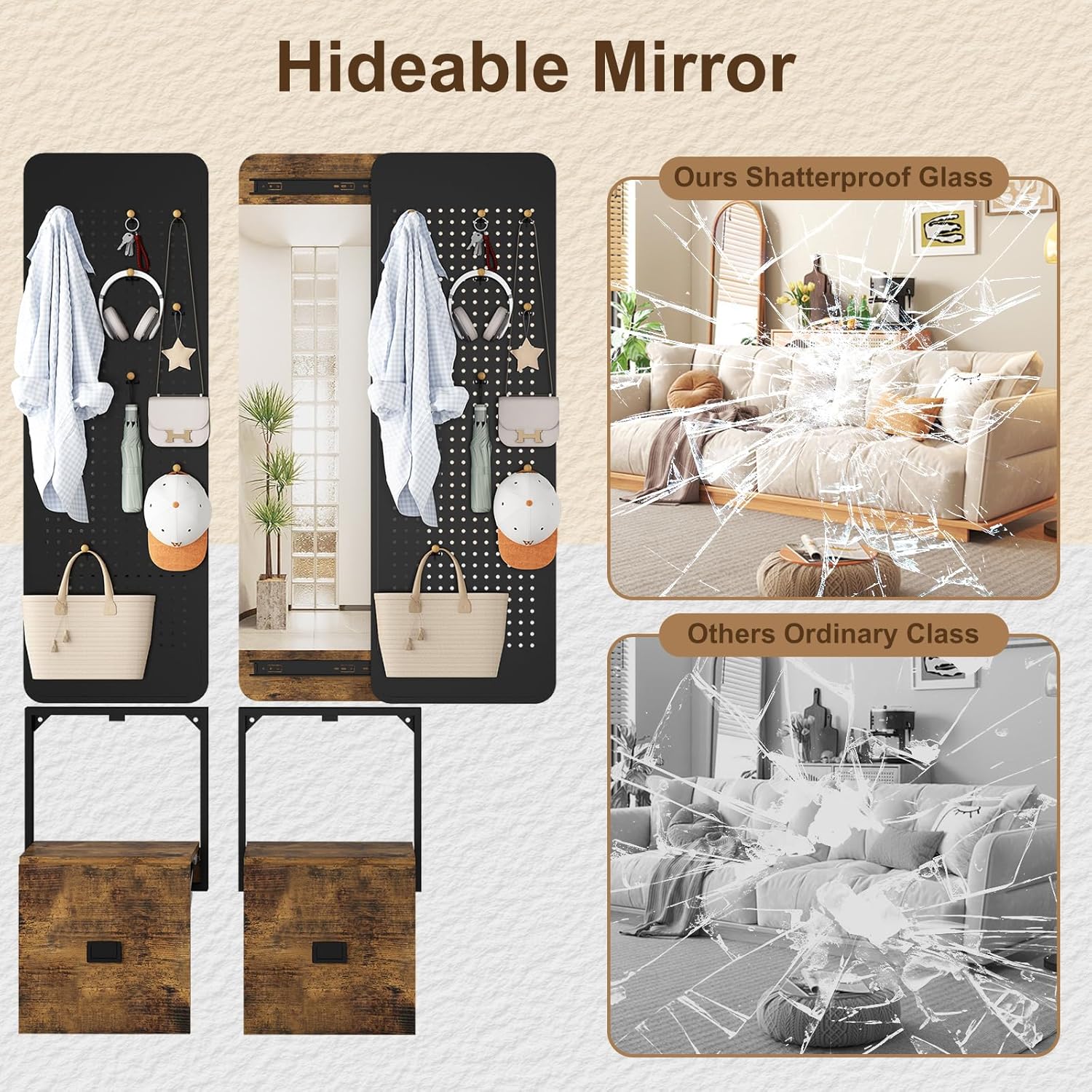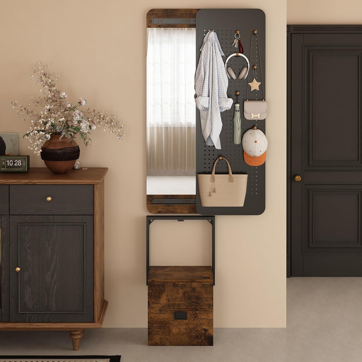 Push and Pull Close Hidden Full Body Mirror , 2 in 1 Full Length Mirror, with Hooks & Display Stand Full Length Mirror with Pegboard, Wall Mirror Compatible with Bathroom, Living Room, Cloakroom
