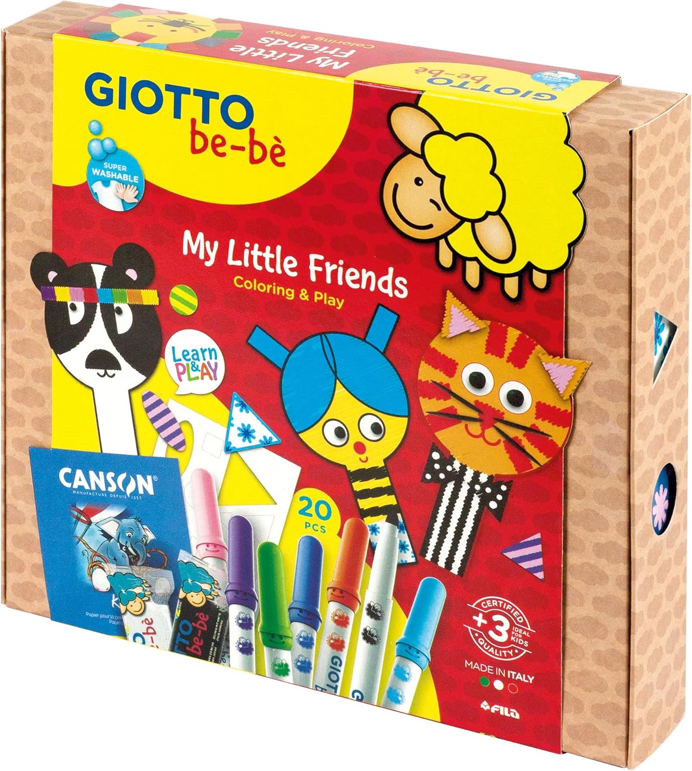 My Little Friends is the new creative set from Giotto be-bè. This extraordinary set introduces a new product concept and offers all the materials you need to make cute animal lovers. The craft card is equipped with a protective case. The inside of the box is very colourful and includes illustrated instructions and a QR code with tips and creative ideas from illustrator Vittora Facchini. Ideal for cultivating your child's manual skills and creativity. The enchanting motifs inside the box encourage play and learning and invite children to invent, cut out and colour. Contains: 14 Giotto Bebè felt tip pens, 1 Canson Kids A5 album with 20 white sheets, 2 sheets of cutting templates, 2 x 50g Giotto bebè clay, 1 pair of scissors