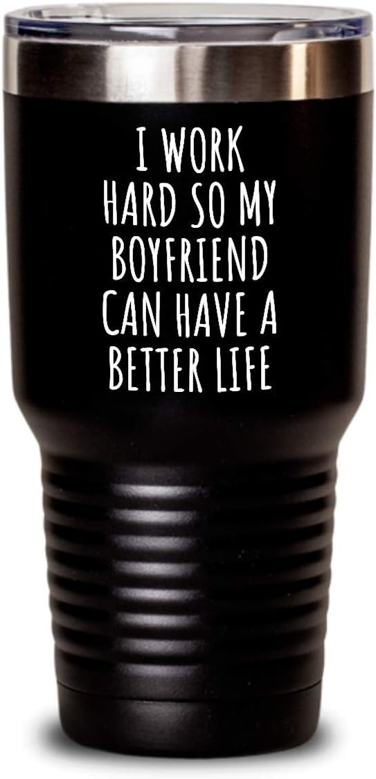 Girlfriend Tumbler Funny Gift For Gf I Work Hard So My Boyfriend Present Idea Birthday Gag Anniversary Joke Insulated Cup With Lid Black 30 Oz SATISFACTION GUARANTEED: Absolutely love your order or contact us and we'll make it right. Your satisfaction is 100% guaranteed. HIGHEST QUALITY TUMBLER & UV PRINTING: This large 30 Ounces stainless steel with powder coating tumbler is professionally printed on one side with high-quality ink and techniques to ensure you the best quality on the market. BEST GIFT IDEA: High-quality & funny insulated tumblers, travel mugs, or car commuters, make a great useful present for women, men, friends, family, coworkers, or anyone you're thinking of! Our huge commuter cups with lid are perfect for any occasion, birthday, anniversary, retirement, Mother's Day, Father's Day, Christmas, or just please yourself! Ideal for outdoor activities or indoors at house or the office. ORIGINAL DESIGN, PROUDLY PRINTED AND SHIPPED FROM USA.