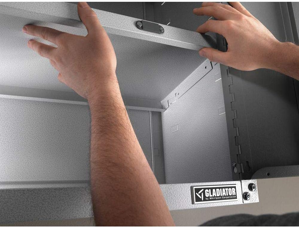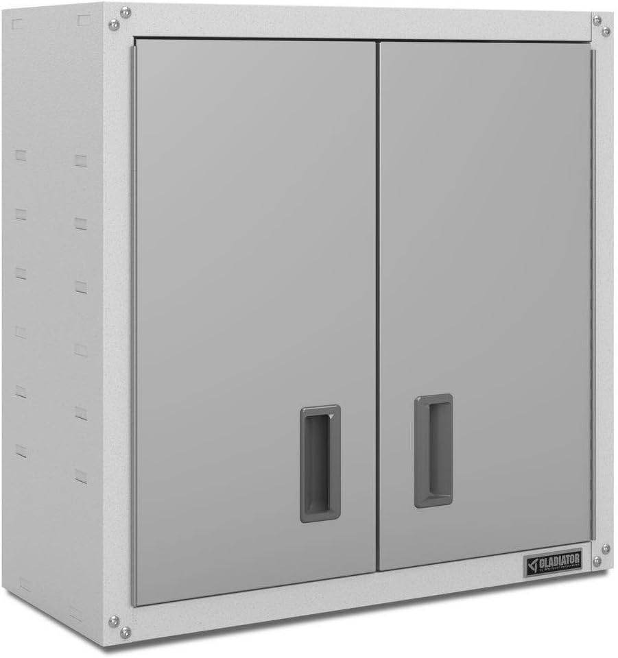 The sleek finish of the ready-to-assemble full-door wall Gearbox makes this cabinet ideal for the garage or other areas of the home like the laundry room or basement. Included brackets allow you to position this storage cabinet on Gladiator wall systems wherever you need it most. Gladiator ready-to-assemble full-door wall Gearbox also available in hammered granite with silver tread and hammered granite with granite slate.