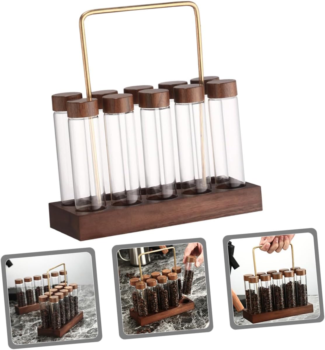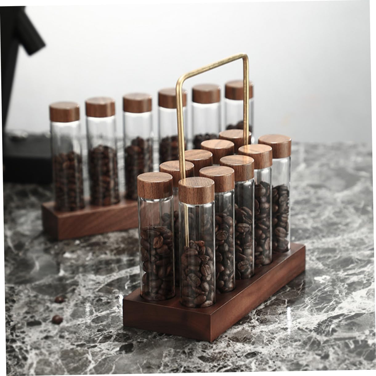 Package Include 1 x Base 10 Tubes Characteristics -Material:Glass, wood and brass coffee bean tube with stand -Product Info:Coffee beans bottling -Color:Dark Red glass tubes with wood stand -Size:21.50X18.80X8.80cm/8.45X7.39X3.46in coffee storage container - Safe and convenient to use, not easy to break or deform, reusable and can be applied for a longtime airtight coffee bean container. - The wooden display stand can be a practical storage or display stand for these glass coffee beans storage tubes coffee bean storage container. - Sealed jar can prevent your dry food from dirt, suitable for home, restaurant kitchen use clear coffee bean storage tube. - Good sealing performance, with a transparent design, which is easy to distinguish the food coffee bean containers. - These glass tubes can be widely used for holding coffee beans, tea, candy, candies, honey, and other kitchen seasoning coffee bean holder.Goods Descriptionglass storage jars This is a set of mini coffee beans display rack and glass tubes, this multifunctional glass storage tube is suitable for storing and preserving a variety of ingredients including coffee beans preserves, jams, chutneys, rice, sugar, flour, tea, coffee, spices, biscuits, which is multipurpose and practical