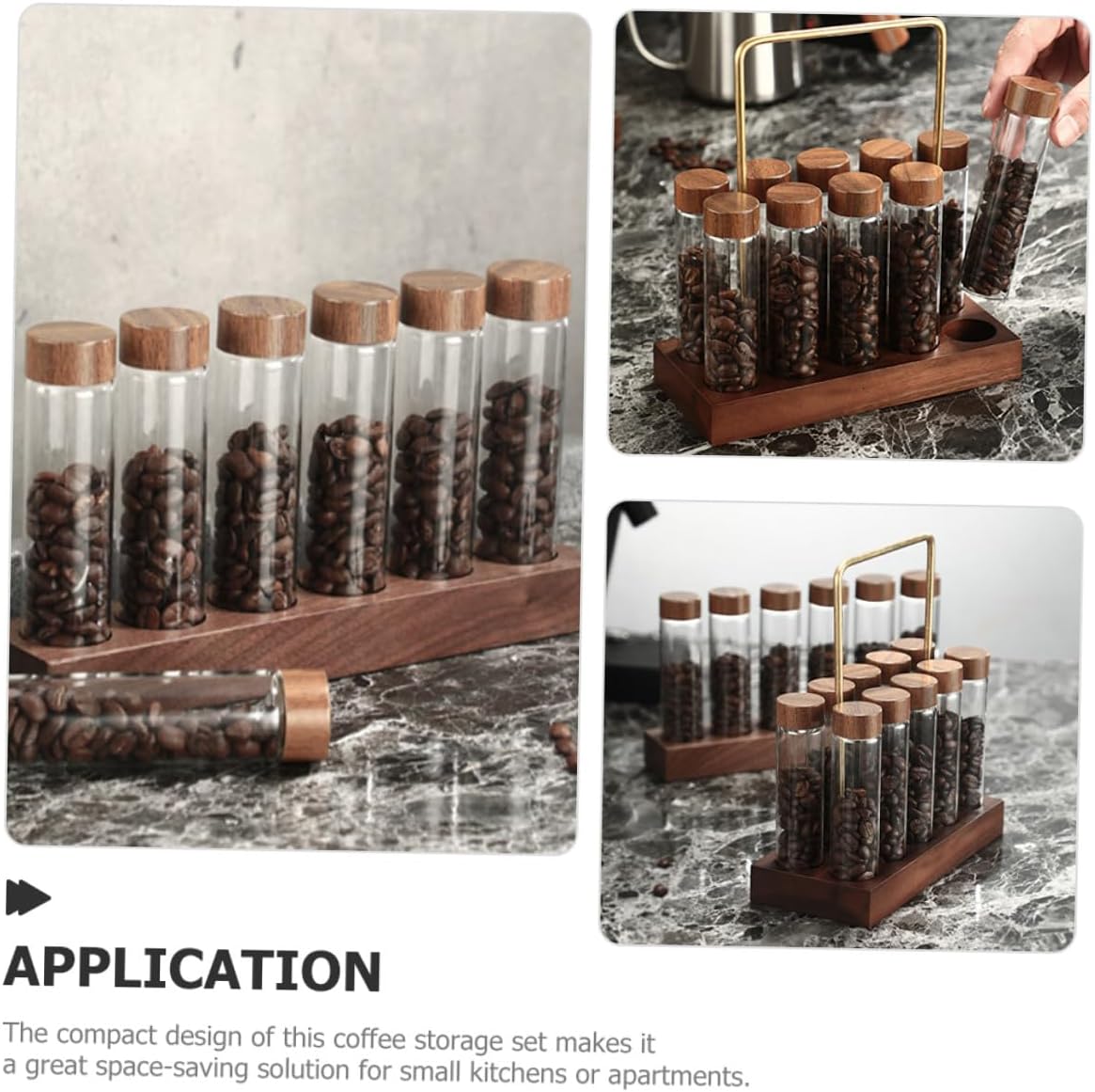 Package List 1 x Base 10 Tubes Features -Product Info:Coffee beans bottling -Size:21.50X18.80X8.80cm/8.45X7.39X3.46in -Material:Glass, wood and brass -Color:Dark Red - The single tube design takes up minimal space, making it suitable for small kitchens or apartments glass coffee bean storage tubes. - Made of good wood and glass materials, this coffee storage set is and sturdy, ensuring long-term use. - The sealed storage tubes can lock in the freshness and aroma of your coffee beans coffee bean tubes. - Each test tube bottle can be easily removed for convenient access to your coffee beans coffee bean storage canister. - The glass display stand and sealed can make it easy to organize and store your coffee beans tubes fresh-keeping jar coffee bean jar.Goods Informationcoffee beans tube Made of glass and wood material, it is strong and sturdy enough for everyday use, which can be used to organize and store food such as coffee beans, tea leaves, grains etc.coffee glass tubes This item is a multipurpose coffee bean storage jars with a sealing lid and wooden stand