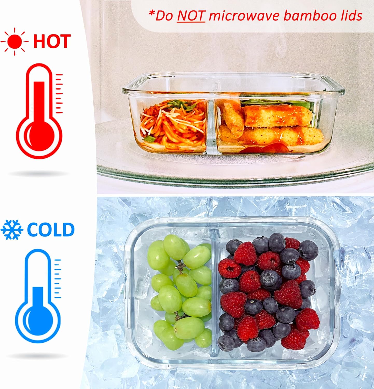 | Material Type | SUSTAINABLE BAMBOO LIDS - reusable, recyclable, green bamboo, free of harmful chemicals, including BPA, PVC, phthalates, lead, melamine, formaldehyde, etc. // MICROWAVABLE, FOOD-GRADE GLASSWARE - heavy duty, heat and shatter proof, compartmentalized borosilicate glass // SILICONE SEALS & VENTS - ocean friendly, insulated silicone rings |