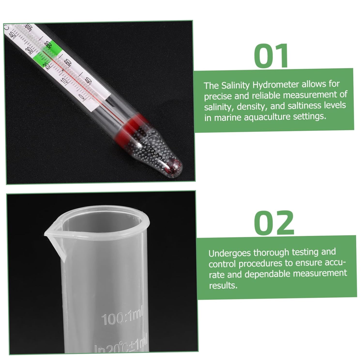 Package List 5 x meter 5 x measuring cylinder 5 x wooden box Characteristics -Color:Transparent Glass Hydrometer -Size:30.00X12.50X6.50cm/11.79X4.91X2.55in Tank Hydrometer -Material:Wood, glass, plastic Aquatic Hydrometer -Measuring cylinder capacity: 100ml Aquarium Areometer -Size:19.50X1.50X1.50cm/7.66X0.59X0.59in Hydrometer for Aquarium -Size:25.00X6.50X6.00cm/9.82X2.55X2.36in Water Meter -Whether you are a professional farmer or a hobbyist with a tank at home, this meter will help you maintain optimal water conditions Water Testing Tool. -The Aquarium Hydrometer is designed to meet the needs of marine aquaculture Densitometer for Tank. -Its precise measurement capabilities allow you to accurately monitor the , density, and saltiness of the water Aquarium -Great craftsmanship, delicate shape, good texture, beautiful look, fashionable and unique Aquarium -Its firm glass materials ensure durability and resistance to damage, providing long-lasting performance Professional Aquarium Test Tool.Goods DescriptionAquarium Salinometer Easy to install and use, it can be easily applied to your motorcycle, a very accessory that will meet your needs well.hydrometer This product is a Hydrometer, which is made of glass material, with good texture, sturdy and