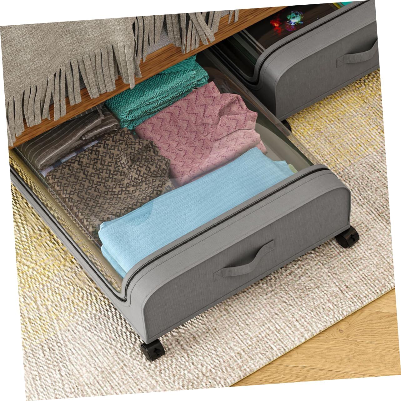 Package Include 1 x Under Bed Organizer Characteristics -Material:Non-woven fabrics, iron, PVC Quilt Clothing Bags -Color:Grey under bed storage containers with wheels -Size:80.00X43.00X16.00cm/31.44X16.90X6.29in storage for small bedrooms - The wheels on the storage bag make it easy for you to move the under bed storage bag underbed storage boxes. - With a large capacity, the under bed storage bag can be used to store clothes, blankets, bedding, , etc Quilts Bag. - The clothes storage bin is for closet, shelf, under bed, to make full use of these places for storage under bed storage. - The under bed design make this storage holder could fully use the under bed storage space, which is practical to use storage bin under bed. - With clear window on the storage box, you can easily see the condition of the inside items storage under bed.Goods DescriptionQuilts Storage Case With its spacious design, this storage cart provides ample room for all your storage needs.bedroom storage This versatile storage box is designed to store clothes, , books, and other items, helping you maintain a clutter- space.under bed storage Equipped with four wheels, it offers easy mobility and cleaning