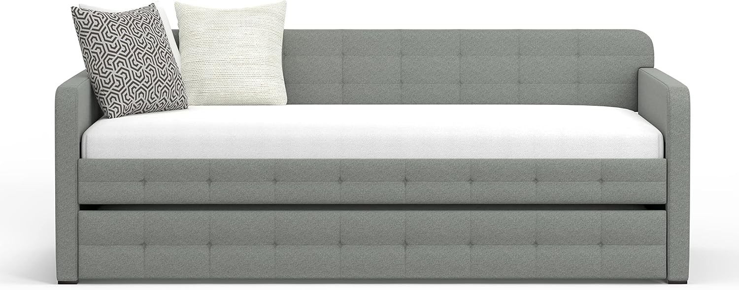 Combining the comfort of your favorite couch with an extra spot to rest, you'll love this versatile accent piece in your guest room or living spaces. Your days with an uncomfortable pull-out sofa or leaky air bed will be a thing of the past. Skillfully crafted with a solid and engineered hardwood frame this stylish daybed with trundle bed is finished with a lush polyester fabric that is soft to the touch while durable to hold up to heavy use. The daybed features notched arms, curved back and adds a classic mid-century look that will add to nearly any existing decor. Both the Daybed and Trundle accommodate twin size mattresses (mattress not included). Simply roll the built-in trundle deck out from under the sofa and you have the perfect spare bed for a guest to get a good night's sleep.